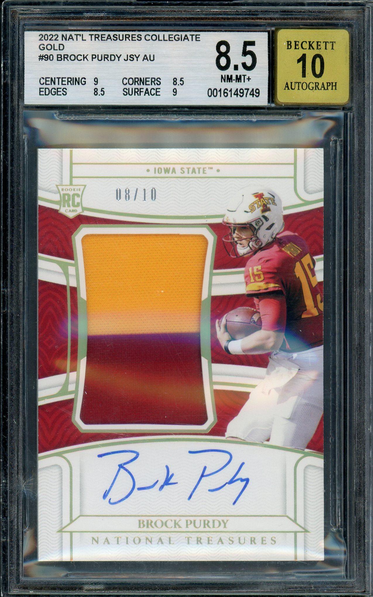 Brock Purdy 2022 Panini National Treasures Collegiate Rookie Patch Autograph Card 8/10! BGS 8.5 Auto 10 POP 1, None Higher!