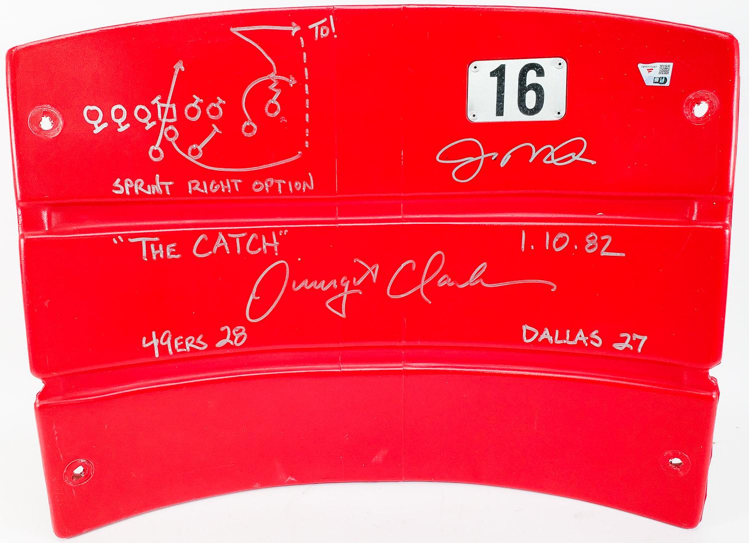 Joe Montana & Dwight Clark "The Catch" & Hand Drawn Play Sketch Signed #16 Seatback (Fanatics Certified)