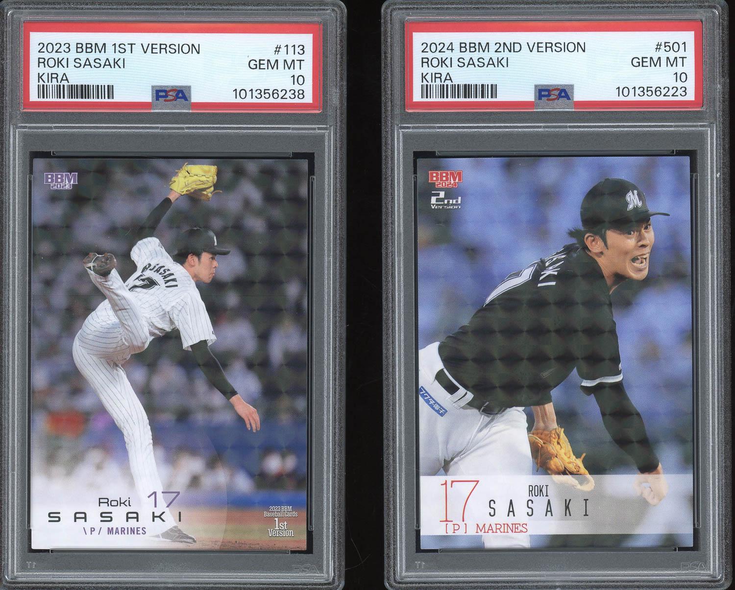 Lot of (2) Roki Sasaki BBM 1st & 2nd Version Kira Cards Both PSA Gem Mint 10!