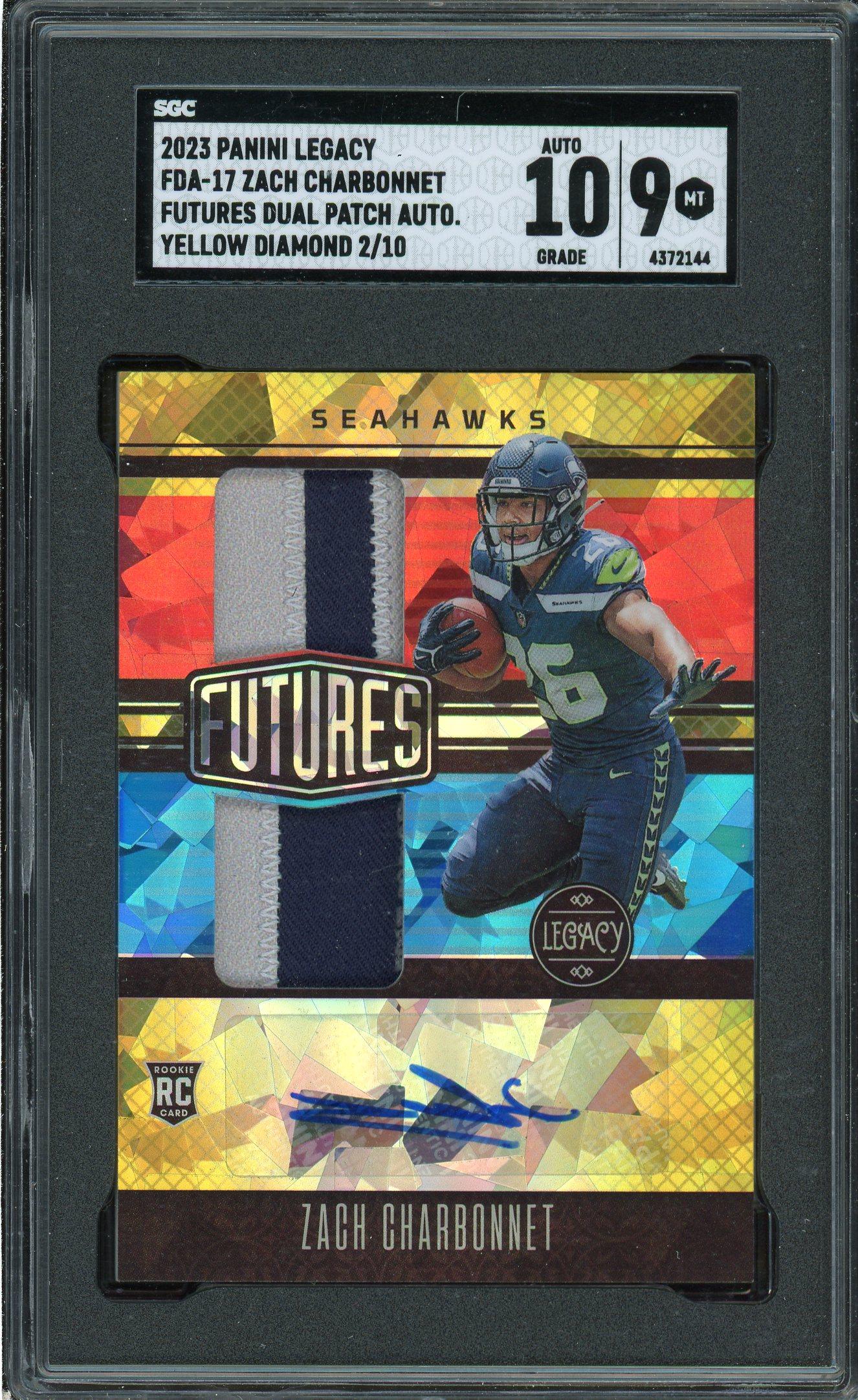Zach Charbonnet 2023 Panini Legacy Futures Dual Patch Yellow Diamond Autograph Rookie Card 2/10! SGC 9 Auto 10!