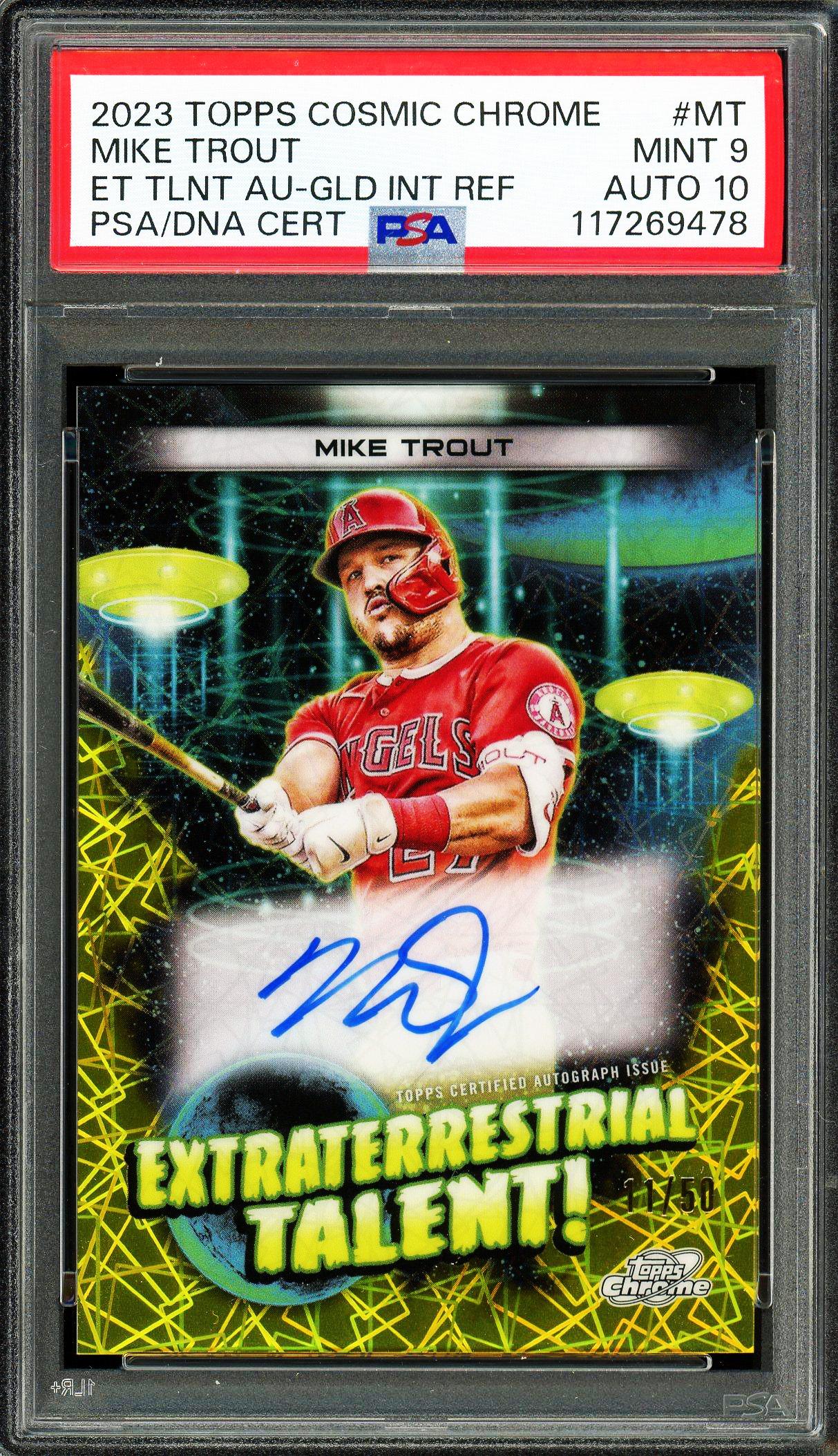 Mike Trout 2023 Topps Cosmic Chrome Extraterrestrial Talent! Gold Refractor Autograph Card 11/50! PSA 9 Auto 10: POP 3, 3 Higher!