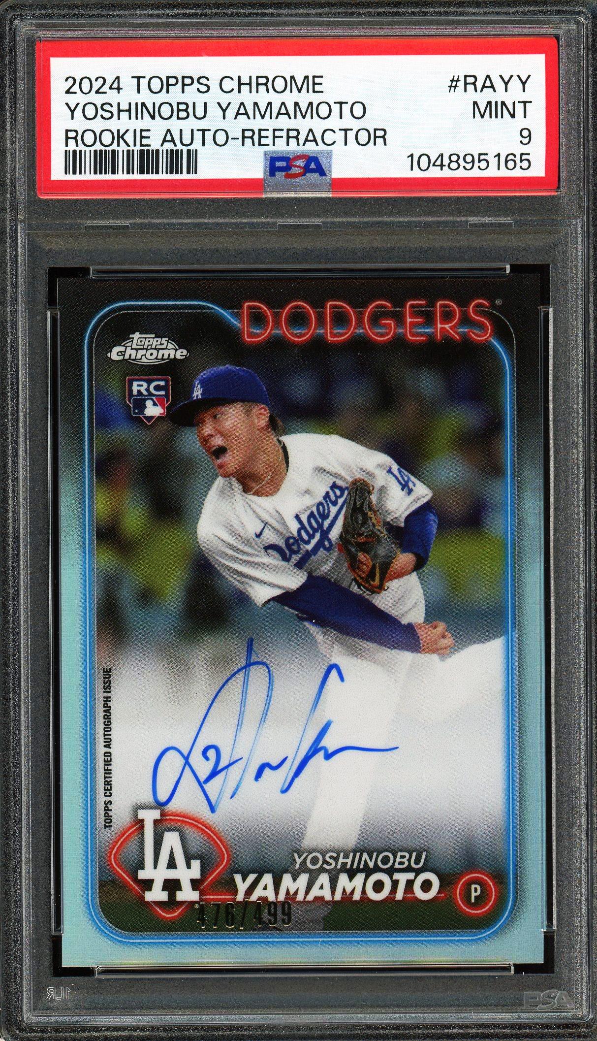 Yoshinobu Yamamoto 2024 Topps Chrome Refractor Rookie Autograph Card 476/499! PSA 9
