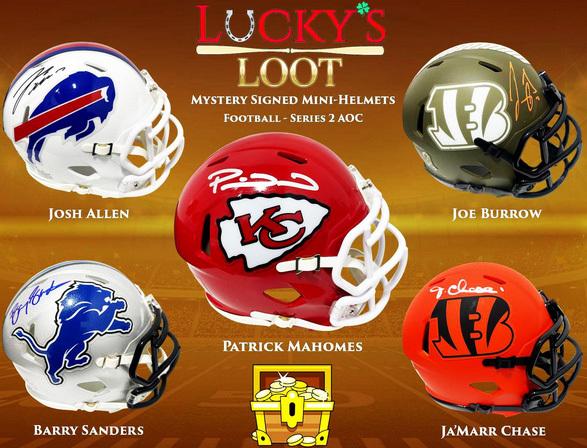 Lucky's Loot Signed Mini Helmet Mystery Box Series 2 : Look for Mahomes, Allen, Burrow, Sanders, Marino, Emmitt, Elway, Irvin, JJ, Nix & much more!