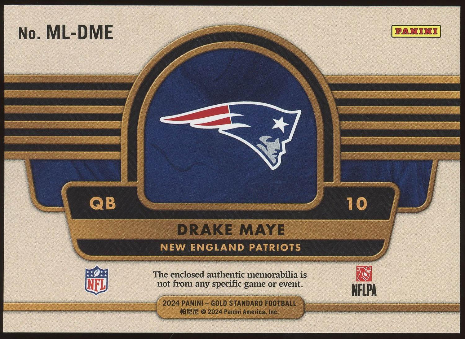 Drake Maye New England Patriots 2024 Panini Gold Standard Mother Lode Rookie Patch Card 249/299! This card has not been autographed nor graded. Please see pictures for details on the condition of this card.