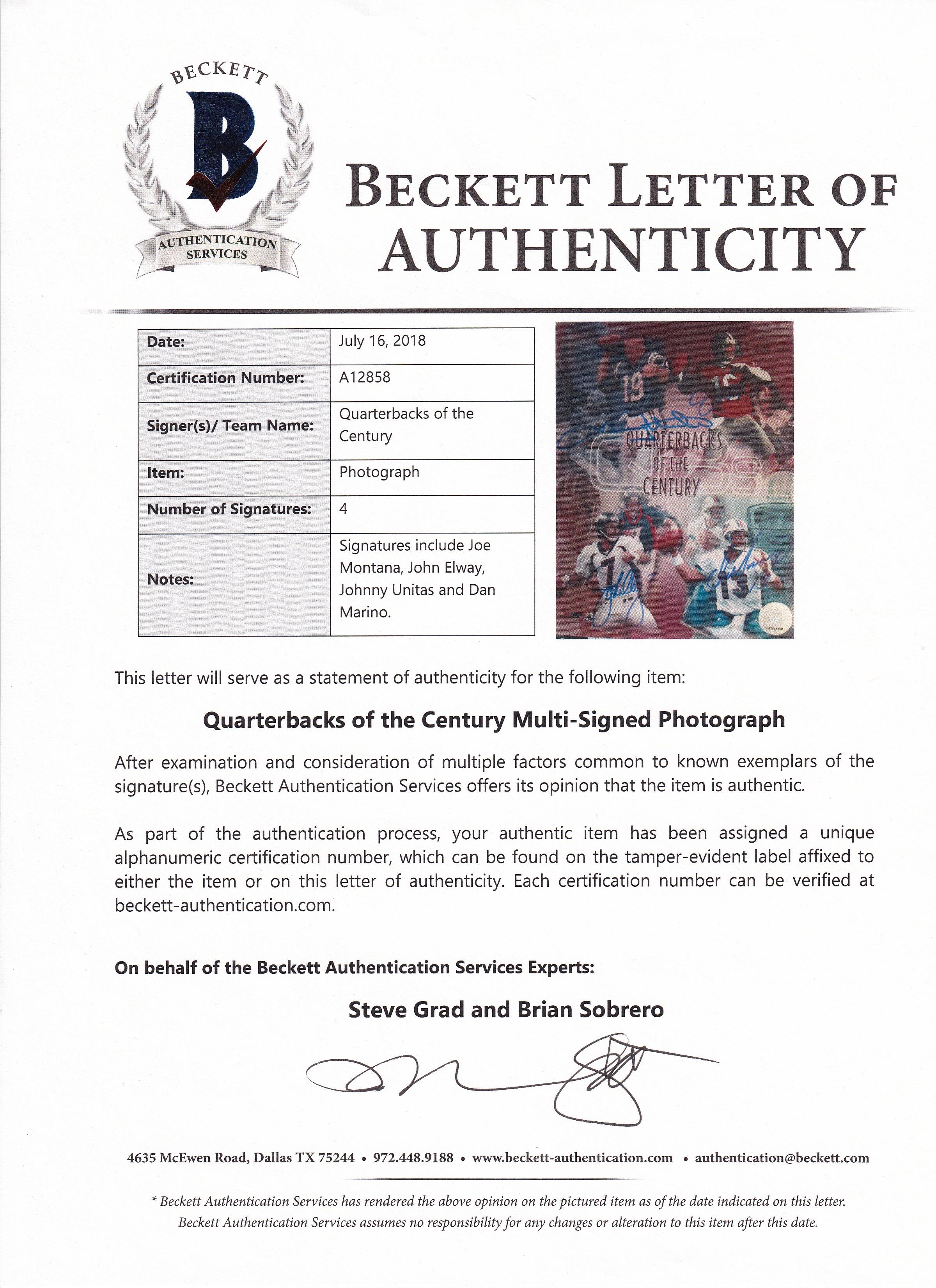 This autographed 8x10 photo has been personally hand-signed by Joe Montana of the San Francisco 49ers, John Elway of the Denver Broncos, Johnny Unitas of the Baltimore Colts and Dan Marino of the Miami Dolphins. This autograph is certified by Beckett Authentication Services (BAS). It comes with the numbered hologram and matching Letter of Authenticity.