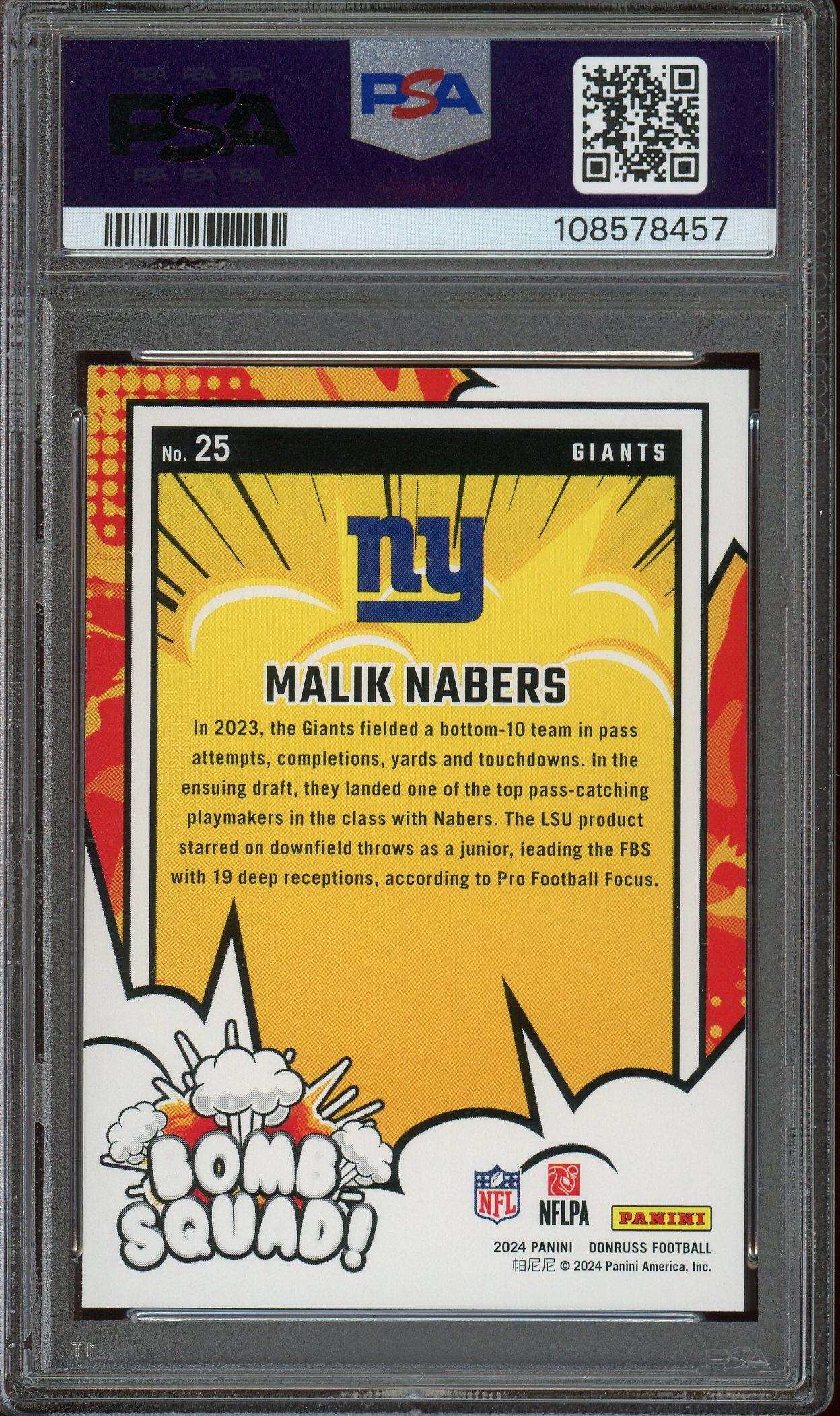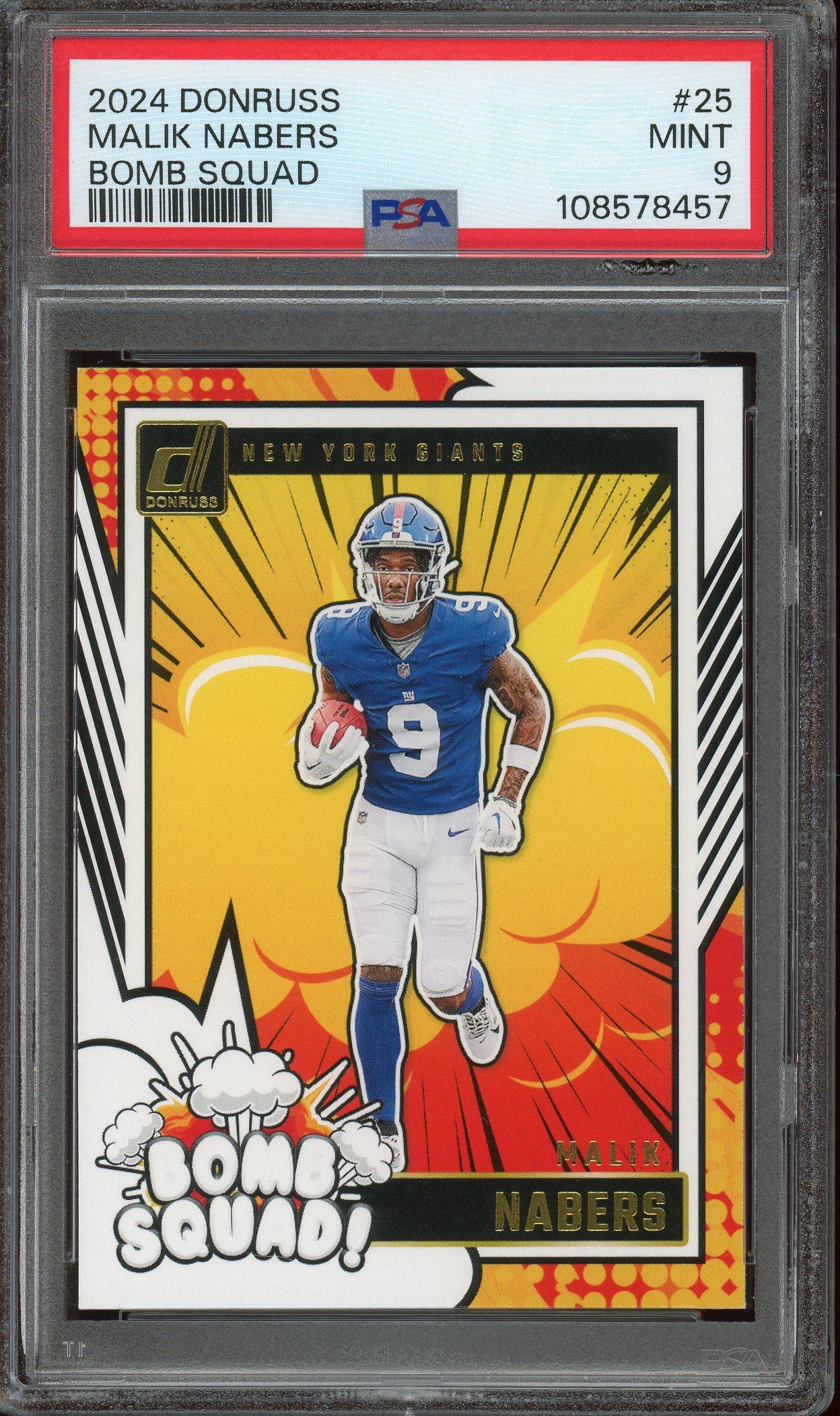 Malik Nabers New York Giants 2024 Donruss Bomb Squad Rookie Card #25. This card has been graded Mint 9 by PSA (Professional Sports Authenticators).