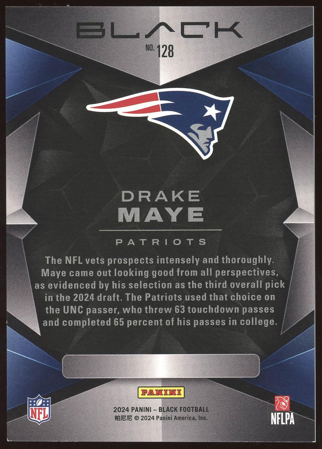 Drake Maye New England Patriots 2024 Panini Black Rookie Card 1/25! This card has not been autographed nor graded. Please see pictures for details on the condition of this card.