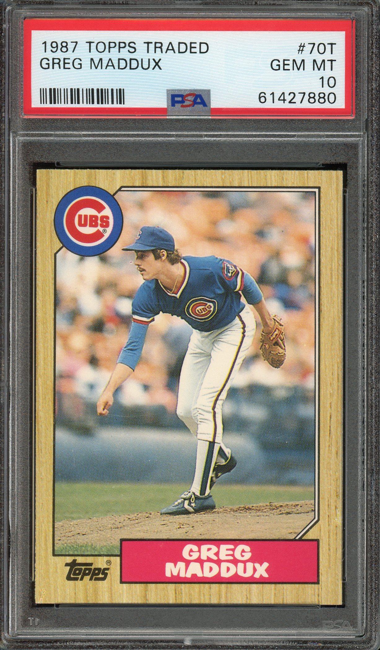 Greg Maddux Chicago Cubs 1987 Topps Traded Rookie Card #70T. This card has been graded Gem Mint 10 by PSA (Professional Sports Authenticators)!