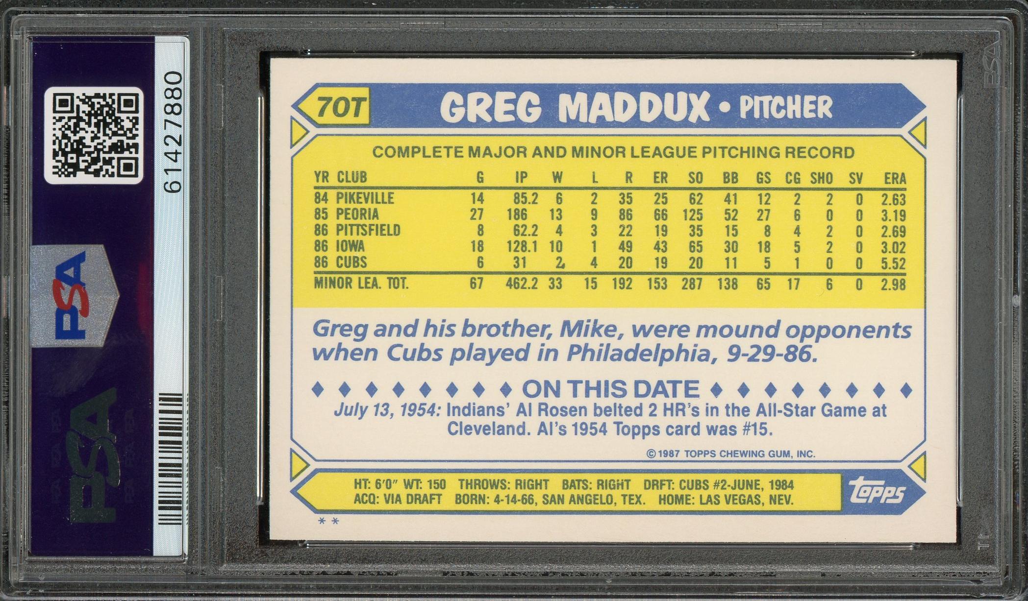 Greg Maddux 1987 Topps Traded Rookie Card #70T PSA Gem Mint 10!
