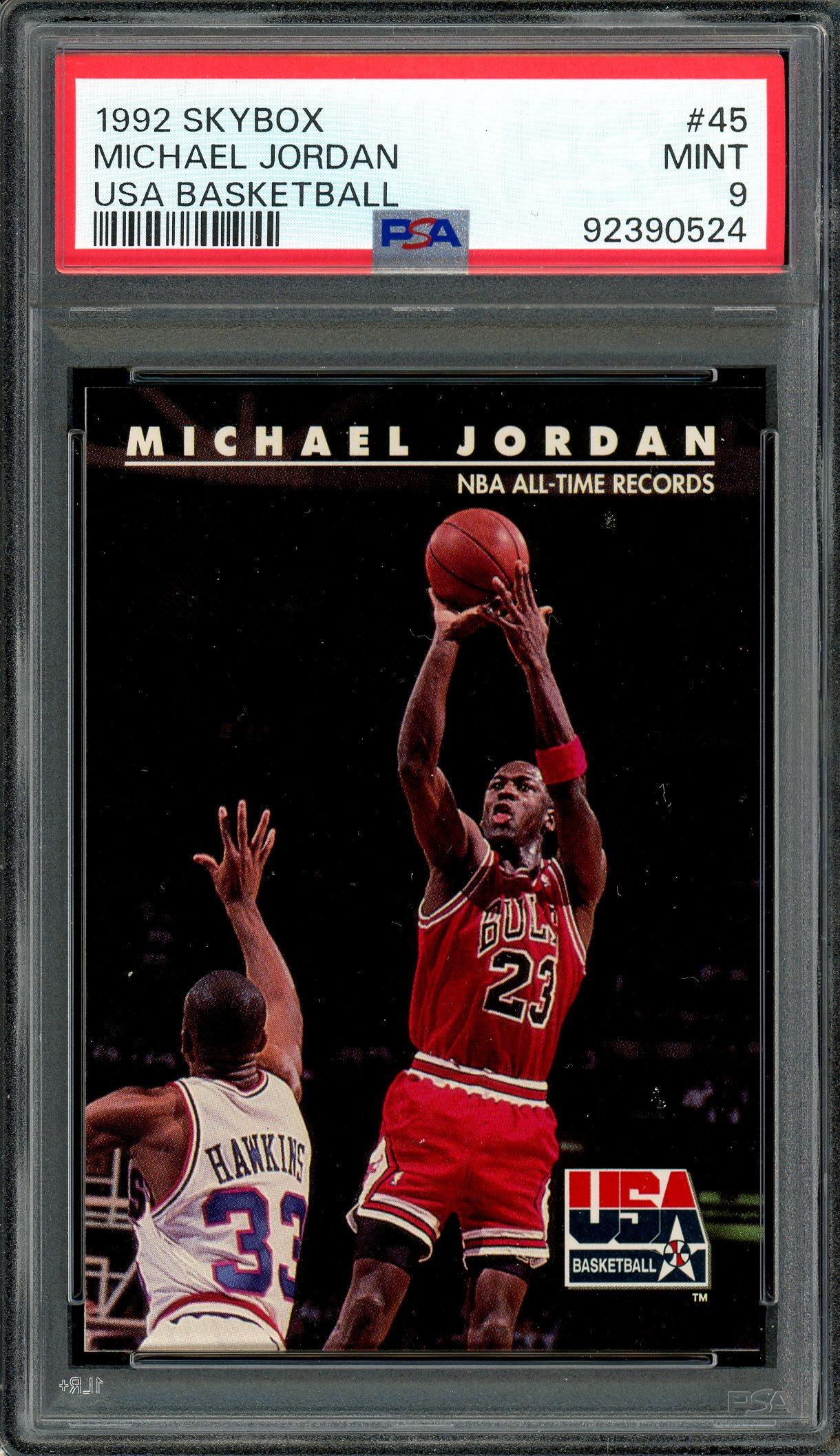 Michael Jordan Chicago Bulls 1992 Skybox USA Basketball Card #45. This card has been graded Mint 9 by PSA (Professional Sports Authenticators).
