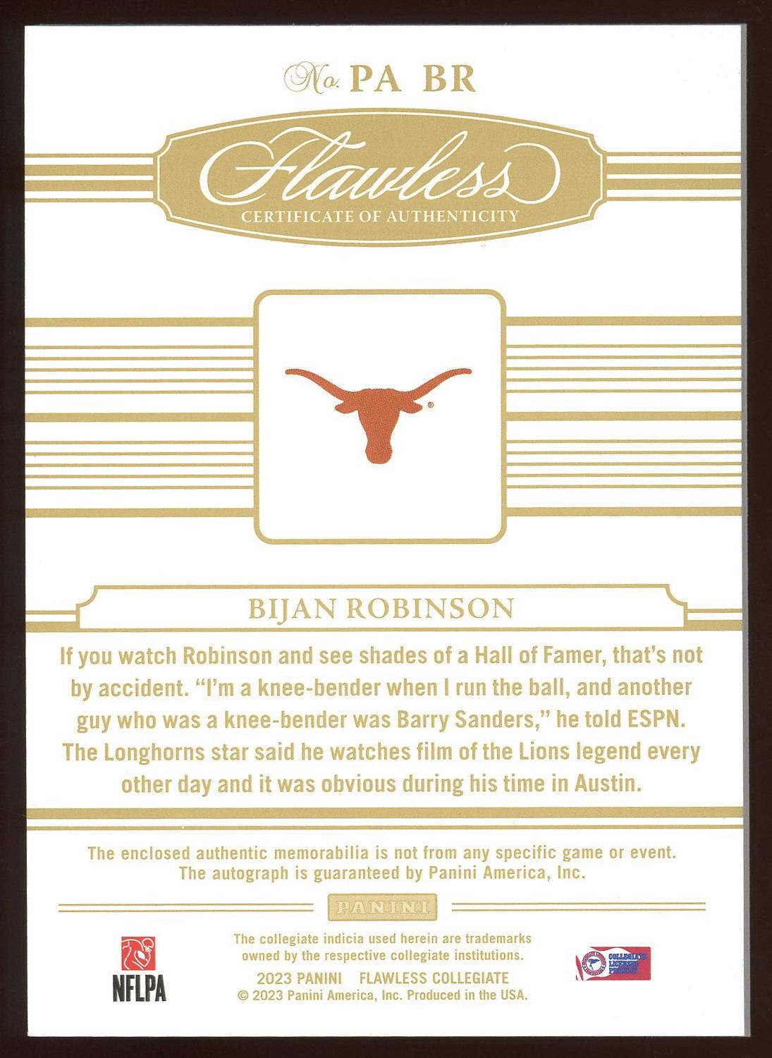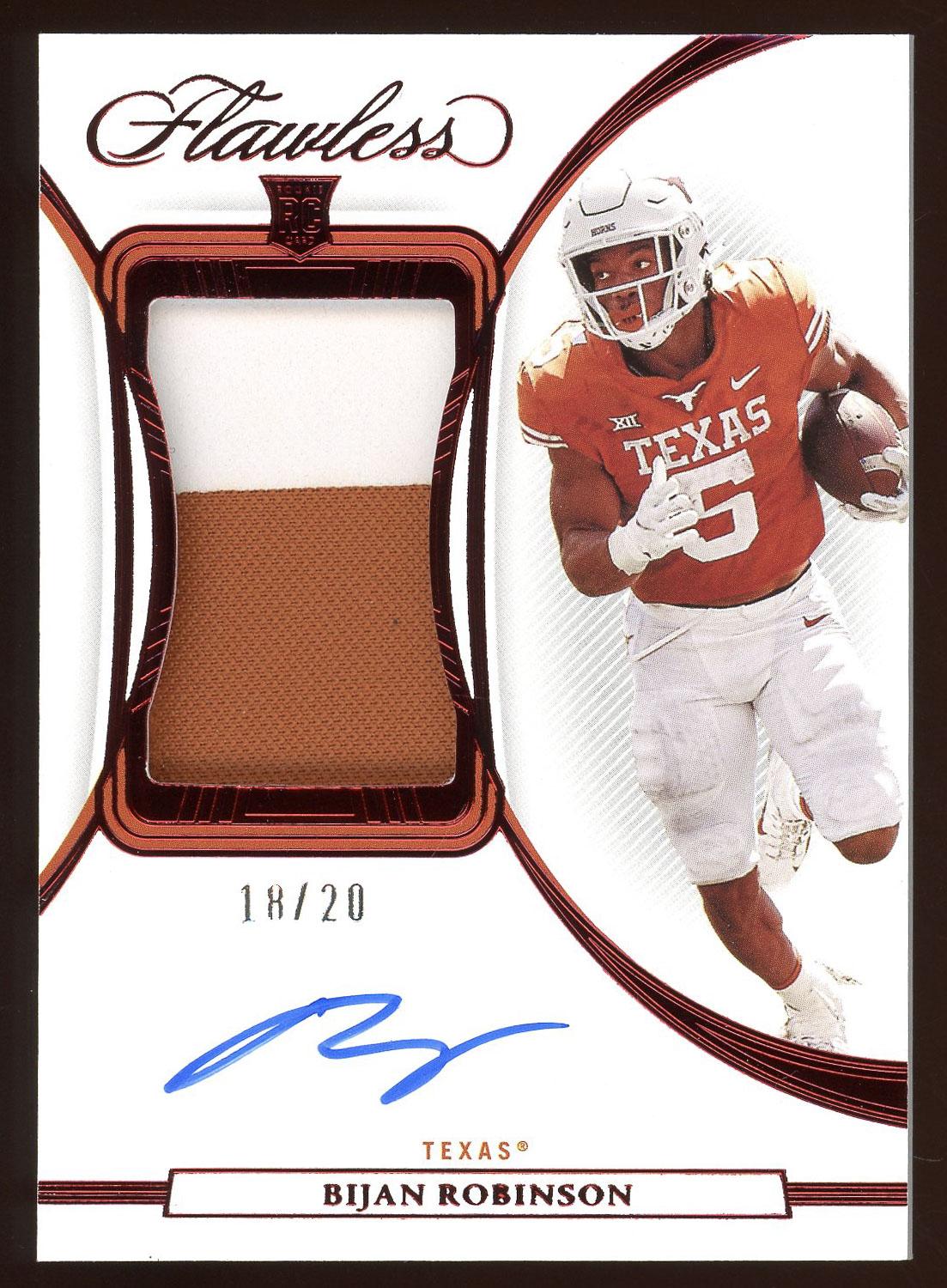 Bijan Robinson Texas Longhorns 2023 Panini Flawless Rookie Patch Autograph Card 18/20! Please see pictures for details on the condition of this card.