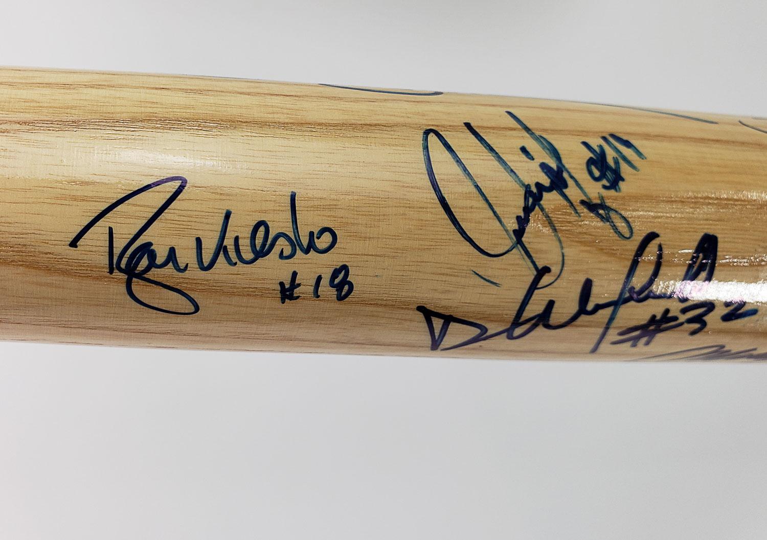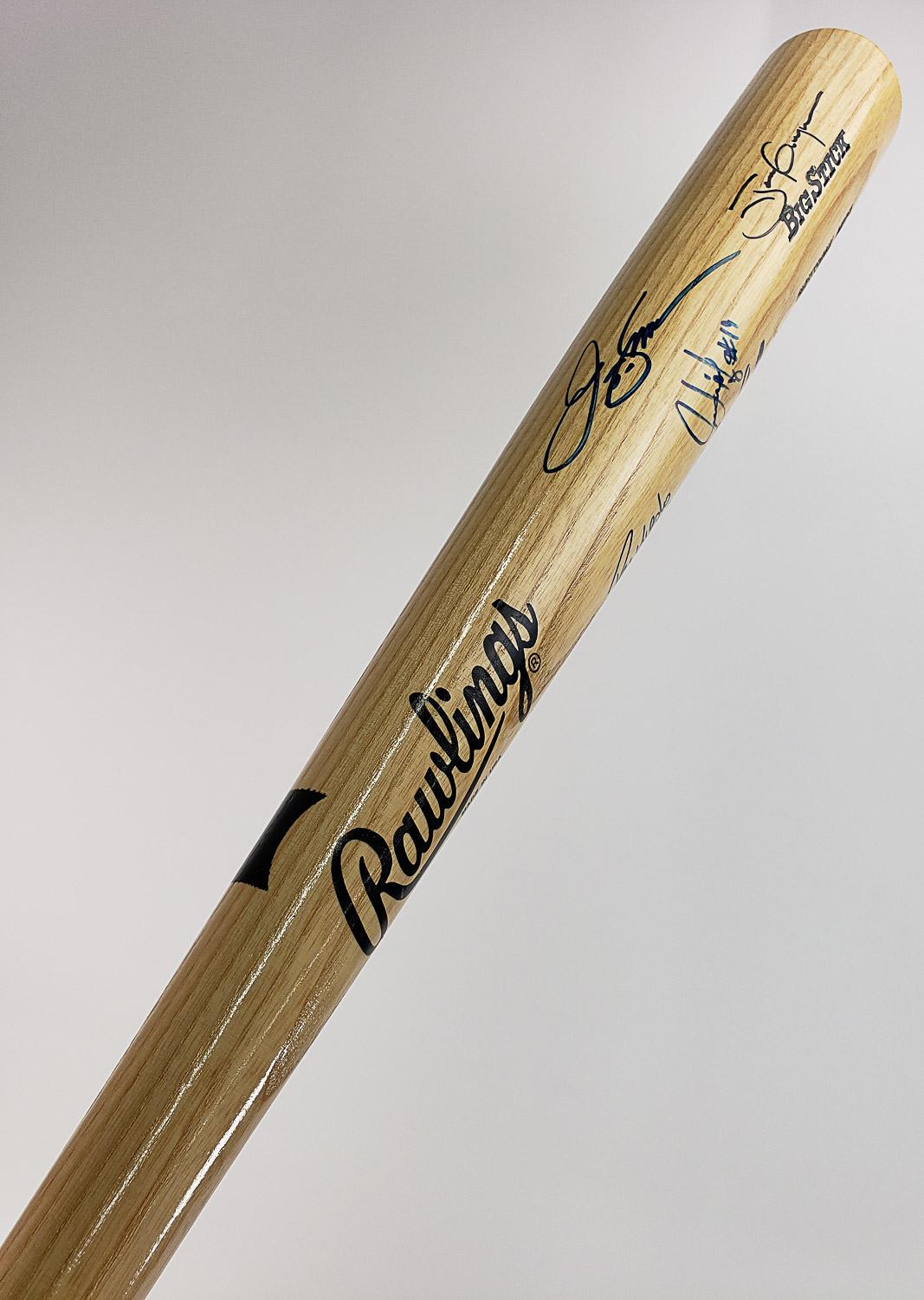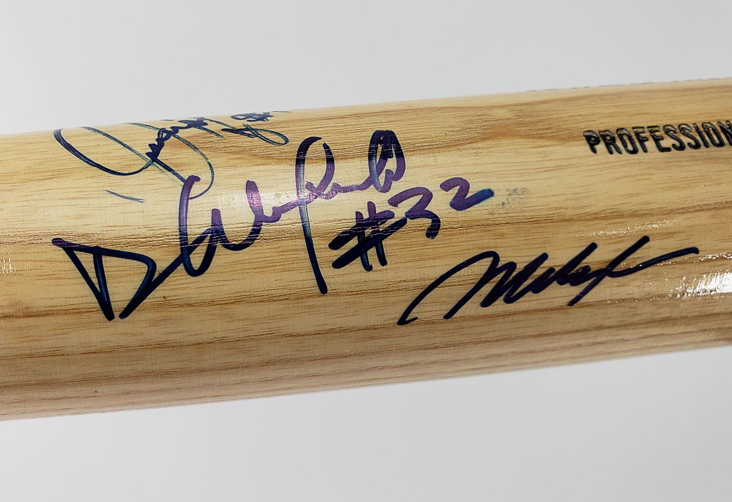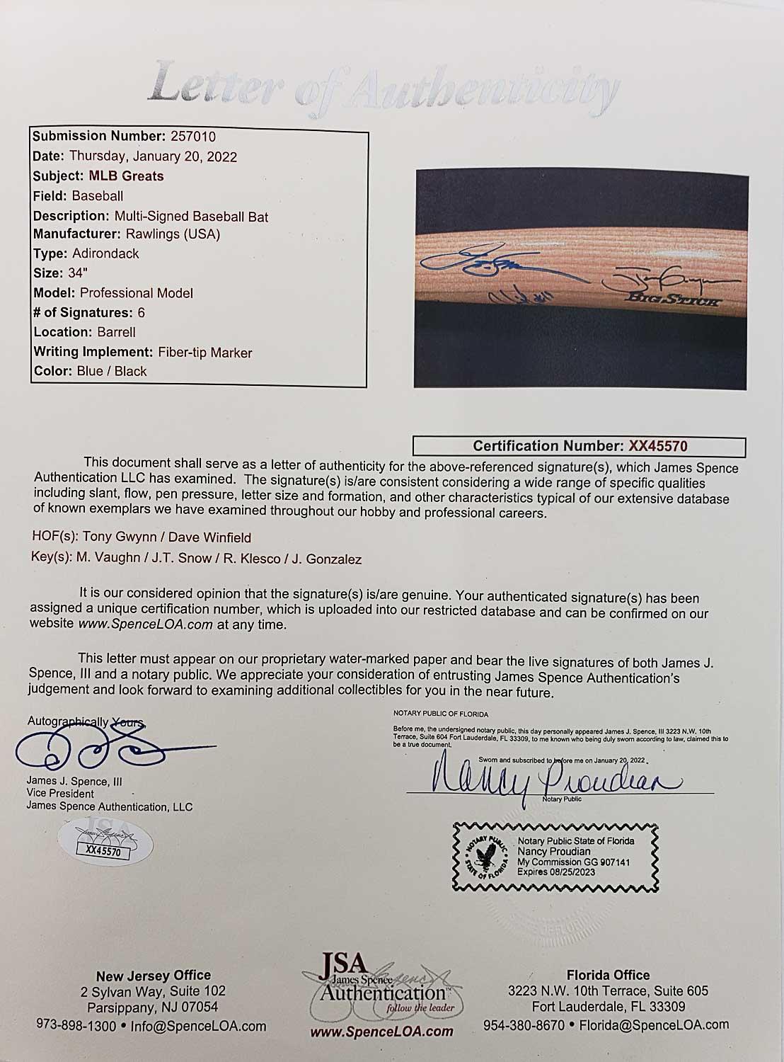 This autographed Rawlings Big Stick baseball bat has been personally hand-signed by 6 MLB legends. Signatures include: Dave Winfield, Tony Gwynn, Mo Vaughn, J.T. Snow, Ryan Klesco and Juan Gonzalez. This autograph is certified by James Spence Authentication (JSA). It comes with the numbered hologram and matching Letter of Authenticity.