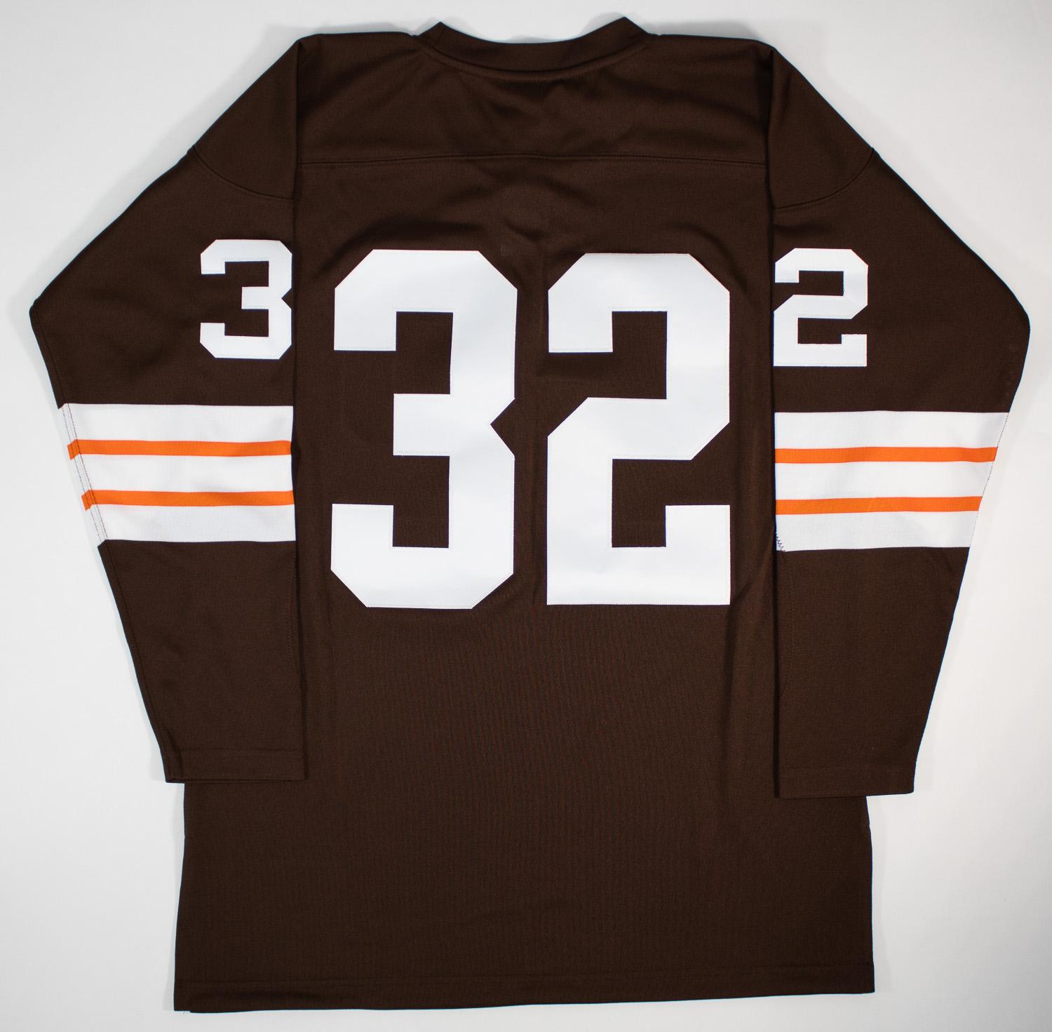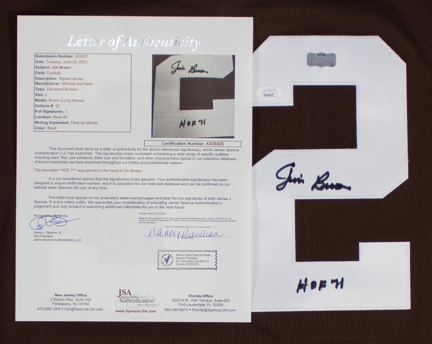 This autographed Mitchell & Ness jersey has been personally hand-signed by Jim Brown ("HOF 71" inscription) of the Cleveland Browns. This autograph is certified by James Spence Authentication (JSA). It comes with the numbered hologram and matching Letter of Authenticity.