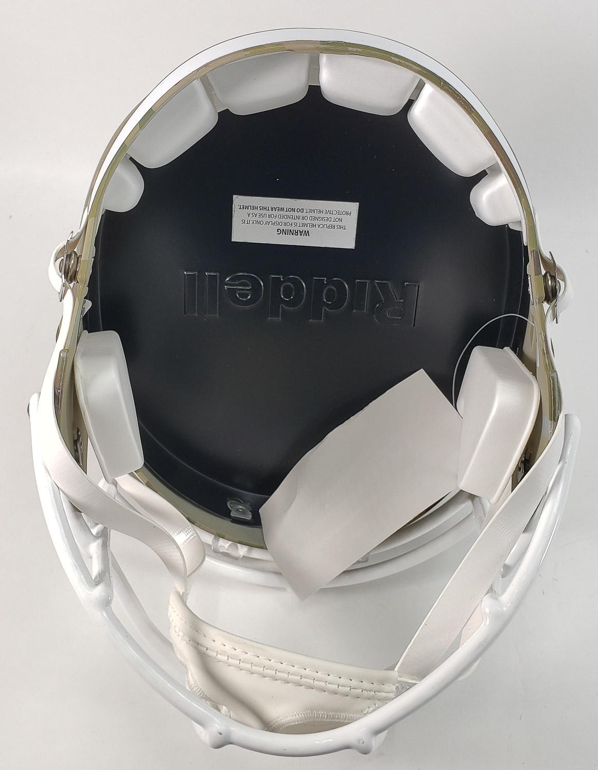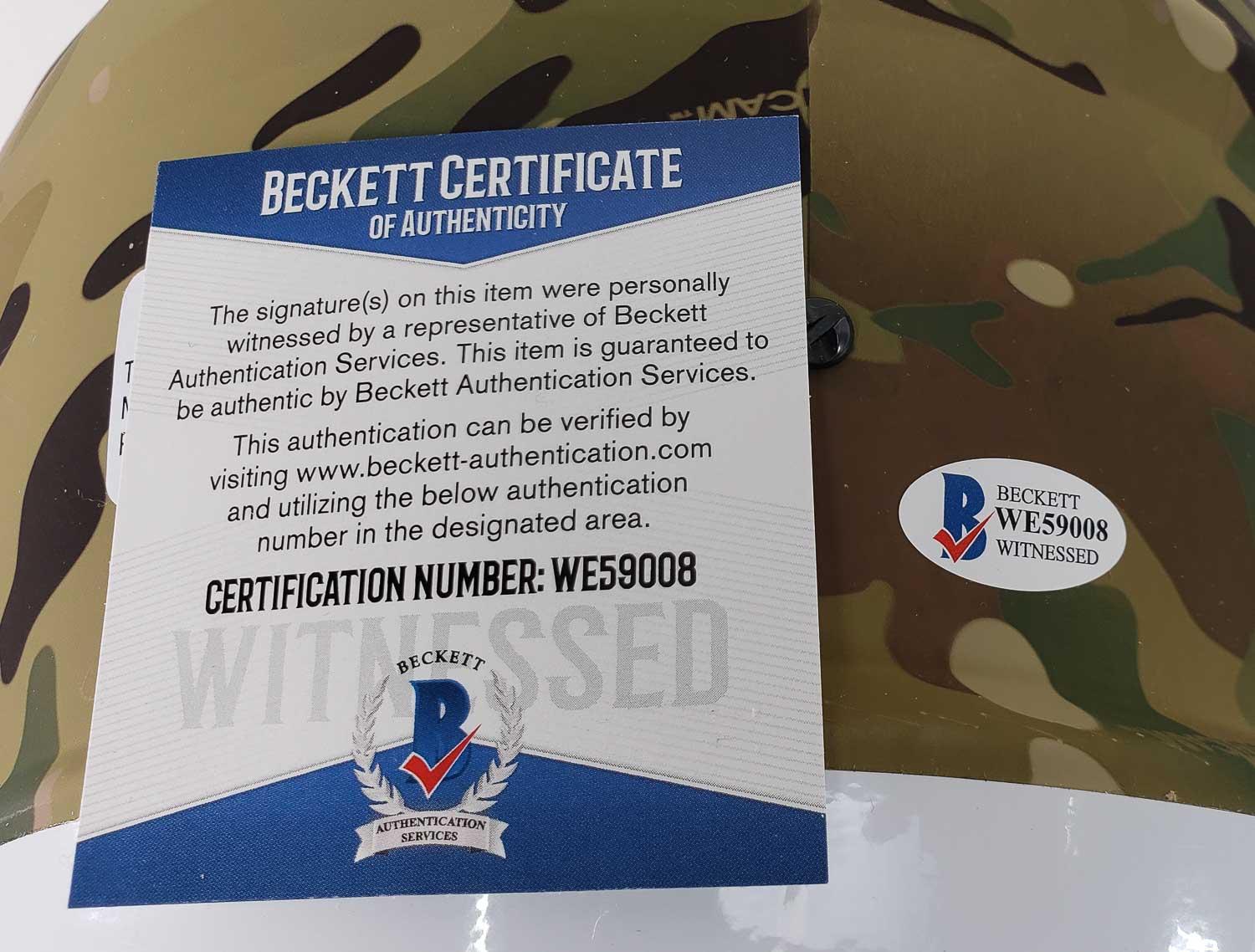 This autographed full size Riddell Camo Alternate speed helmet has been personally hand-signed by Patrick Mahomes & Travis Kelce of the Kansas City Chiefs. This autograph is certified by Beckett Authentication Services (BAS) Witness Certification. That means that a Beckett representative was present when this item was signed. It comes with the numbered authentication hologram.