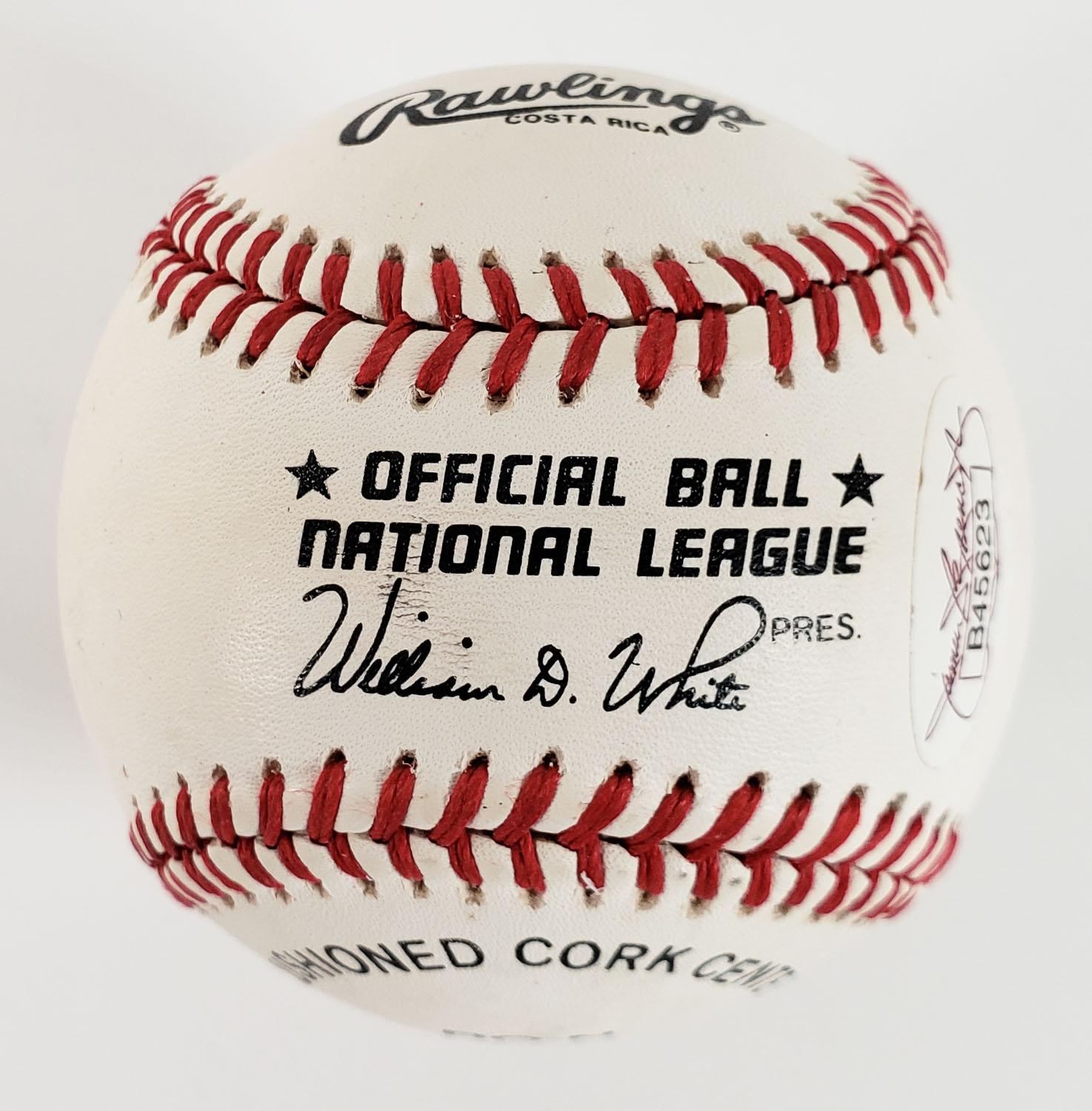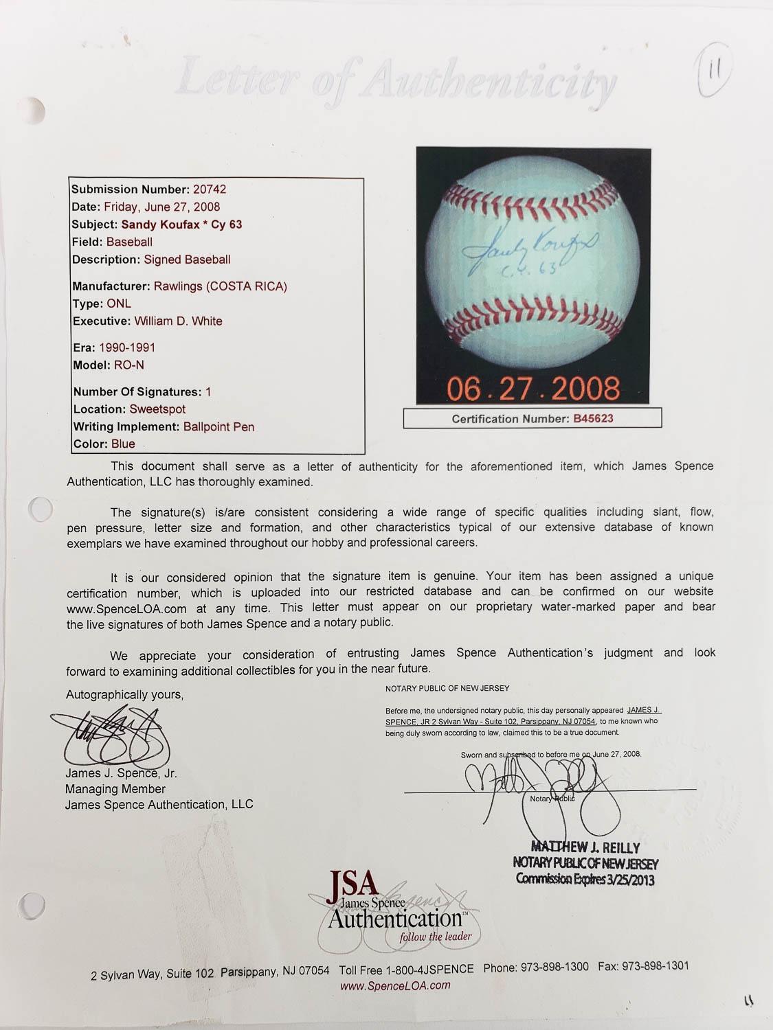 This autographed ONL baseball has been personally hand-signed by Sandy Koufax ("CY 63" inscripton) of the Brooklyn Dodgers. This autograph is certified by James Spence Authentication (JSA). It comes with the numbered hologram and matching Letter of Authenticity.