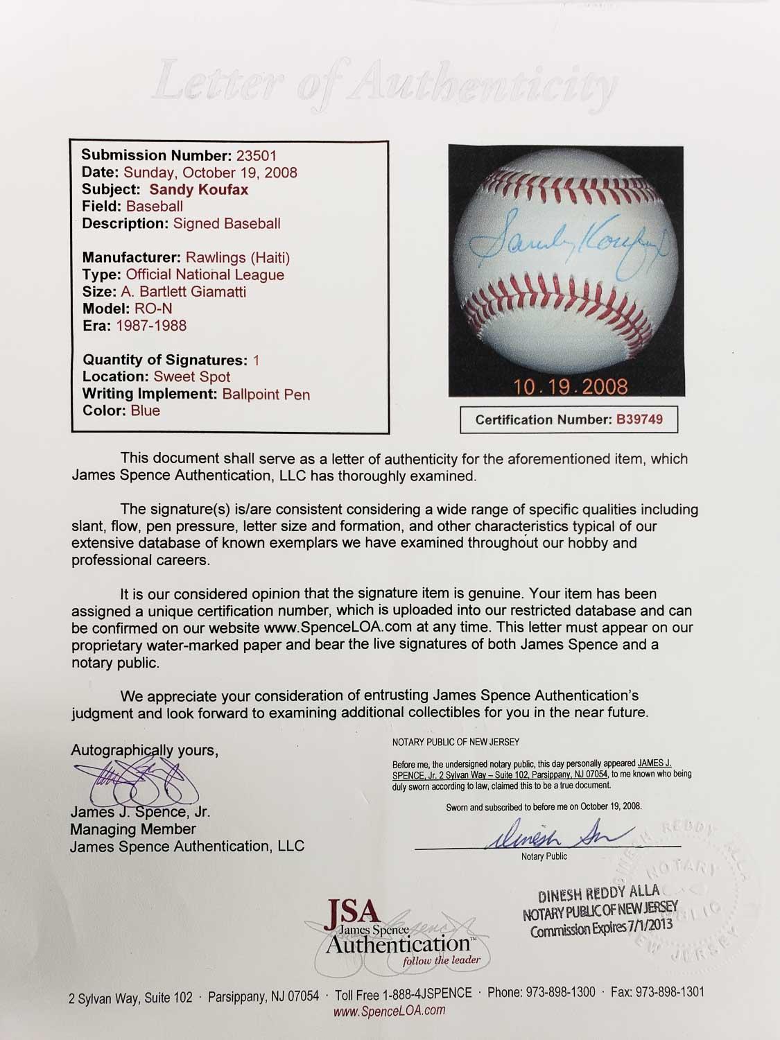 This autographed ONL baseball has been personally hand-signed by Sandy Koufax of the Brooklyn Dodgers. This autograph is certified by James Spence Authentication (JSA). It comes with the numbered hologram and matching Letter of Authenticity.