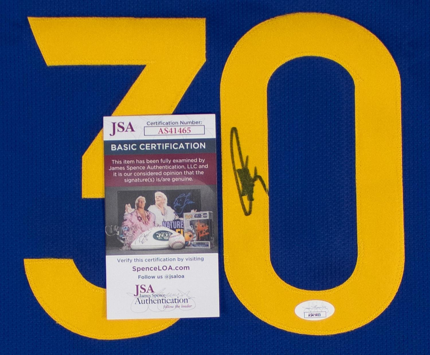 This autographed Nike replica Swingman jersey has been personally hand-signed by Stephen Curry of the Golden State Warriors. This autograph is certified by James Spence Authentication (JSA). It comes with the numbered hologram and matching Certificate of Authenticity.