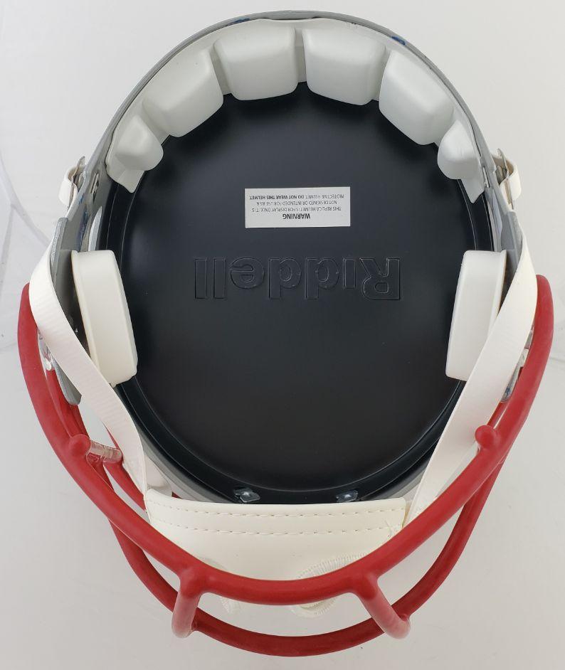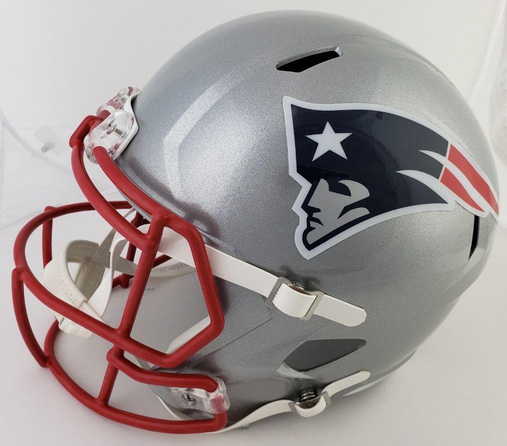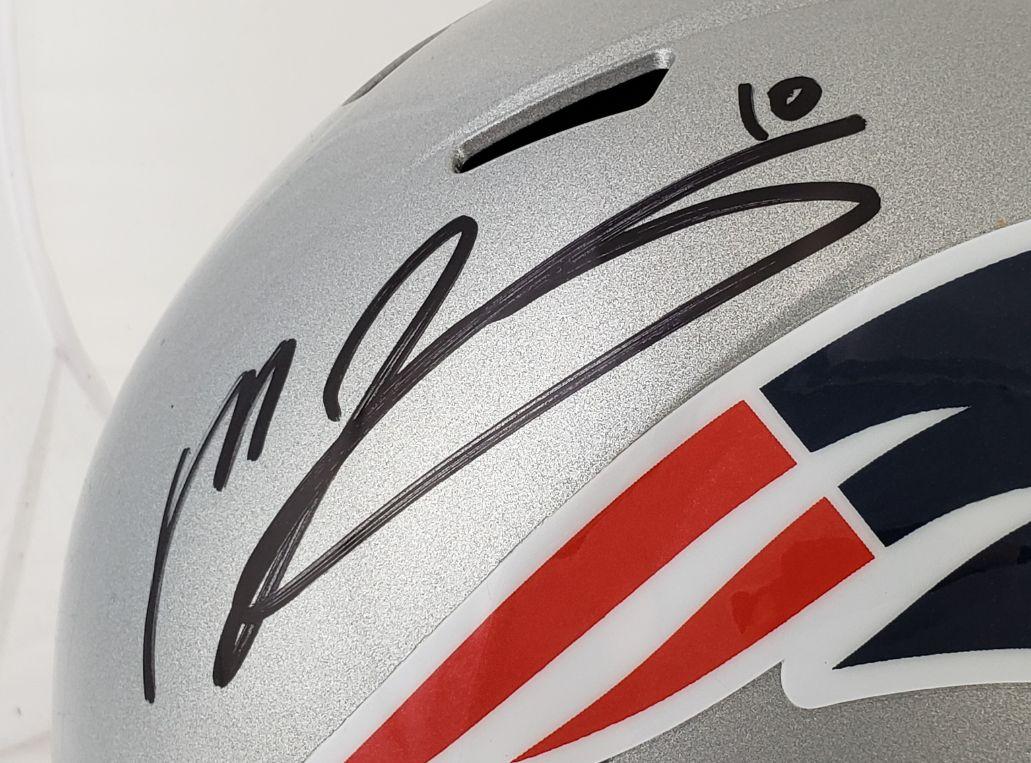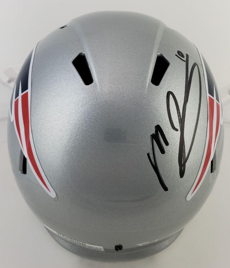 This autographed full size Riddell replica Speed helmet has been personally hand-signed by Mac Jones of the New England Patriots. This autograph is certified by Fanatics. It comes with the numbered hologram which can be verified on Fanatics.com.