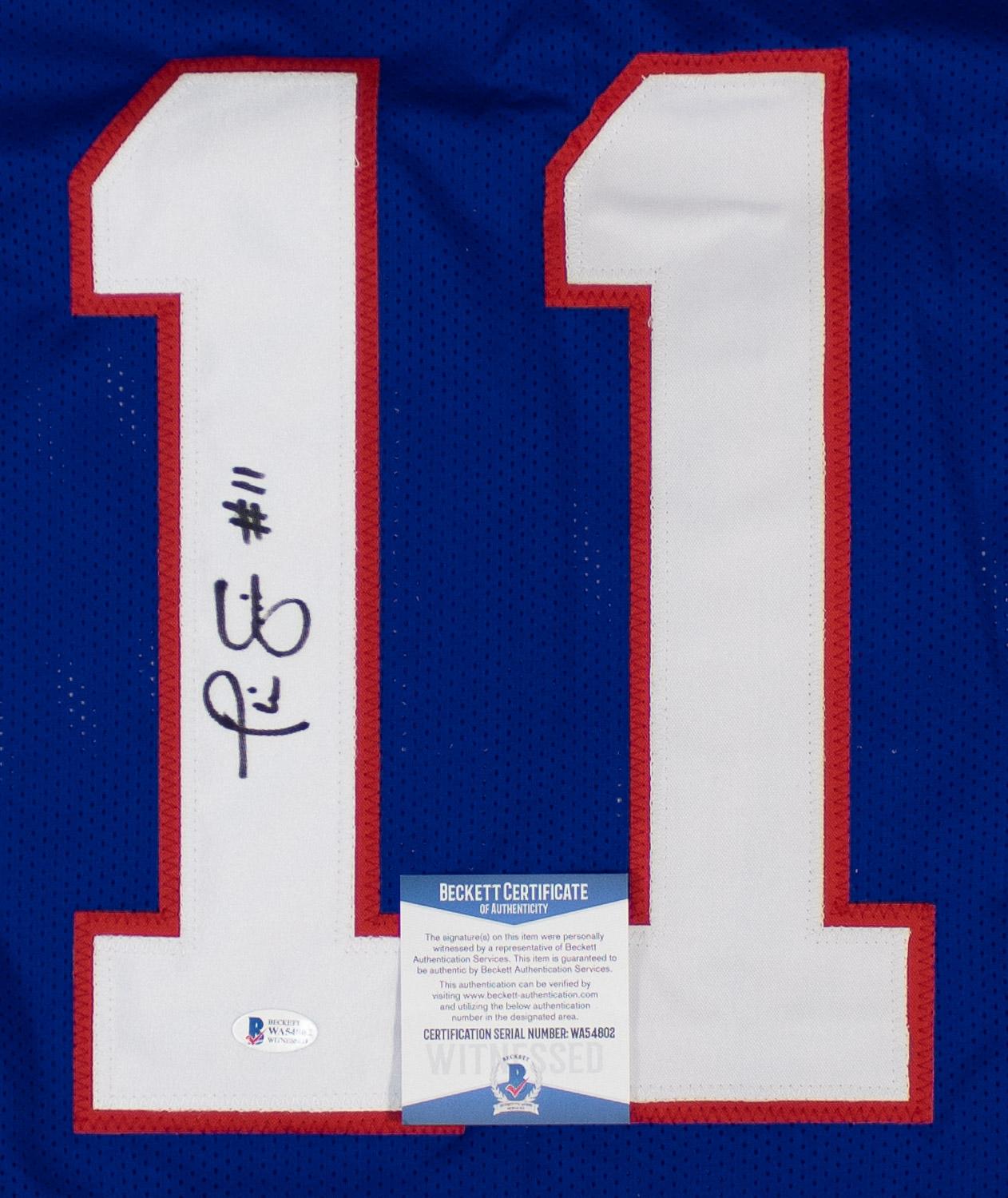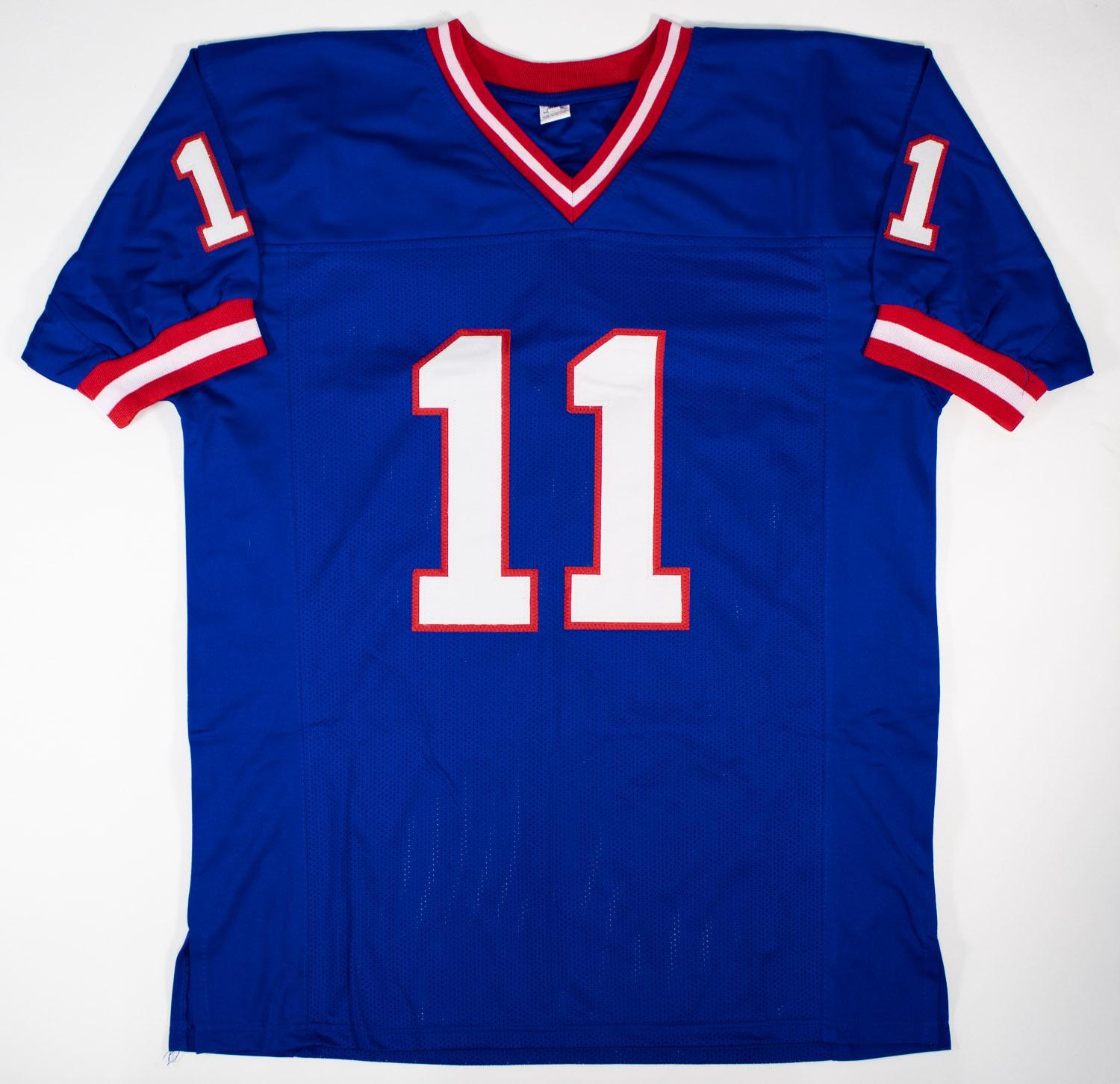 This autographed jersey has been personally hand-signed by Phil Simms of the New York Giants. This autograph is certified by Beckett Authentication Services (BAS) Witness Certification. That means that a Beckett representative was present when this item was signed. It comes with the numbered hologram and matching Certificate of Authenticity. Custom on-field style jerseys are a more affordable option for autograph seekers. These jerseys do not have any brand name or tags and are made in the Philippines. They feature stitched on names and numbers and are made to look very similar to the on-field jerseys that the players wear. These custom jerseys are very commonly used in the memorabilia industry.