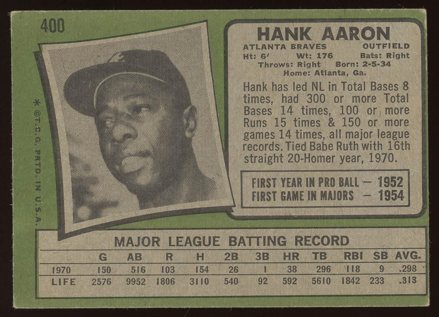 Hank Aaron Atlanta Braves 1971 Topps Card #400. Please see pictures for details on the condition of this card.