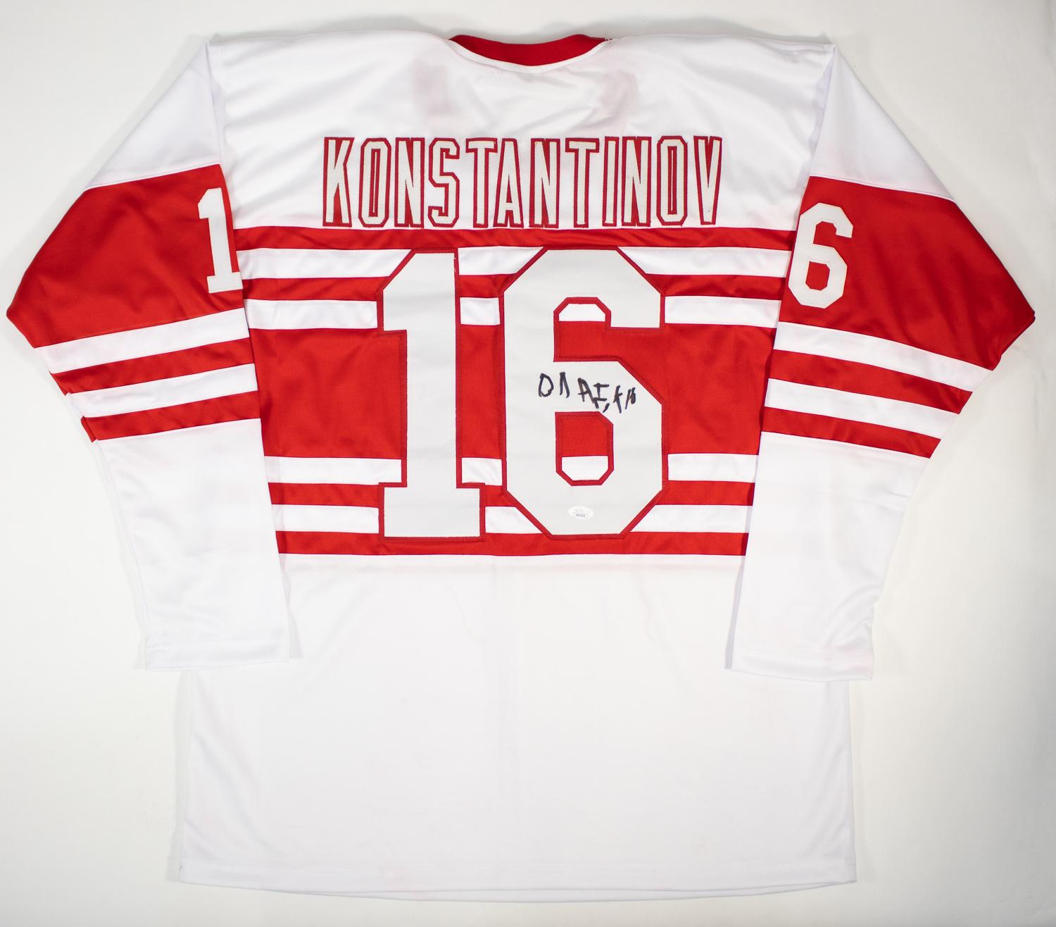 This autographed jersey has been personally hand-signed by Vladimir Konstantinov of the Detroit Red Wings. This autograph is certified by James Spence Authentication (JSA). It comes with the numbered hologram and matching Certificate of Authenticity.