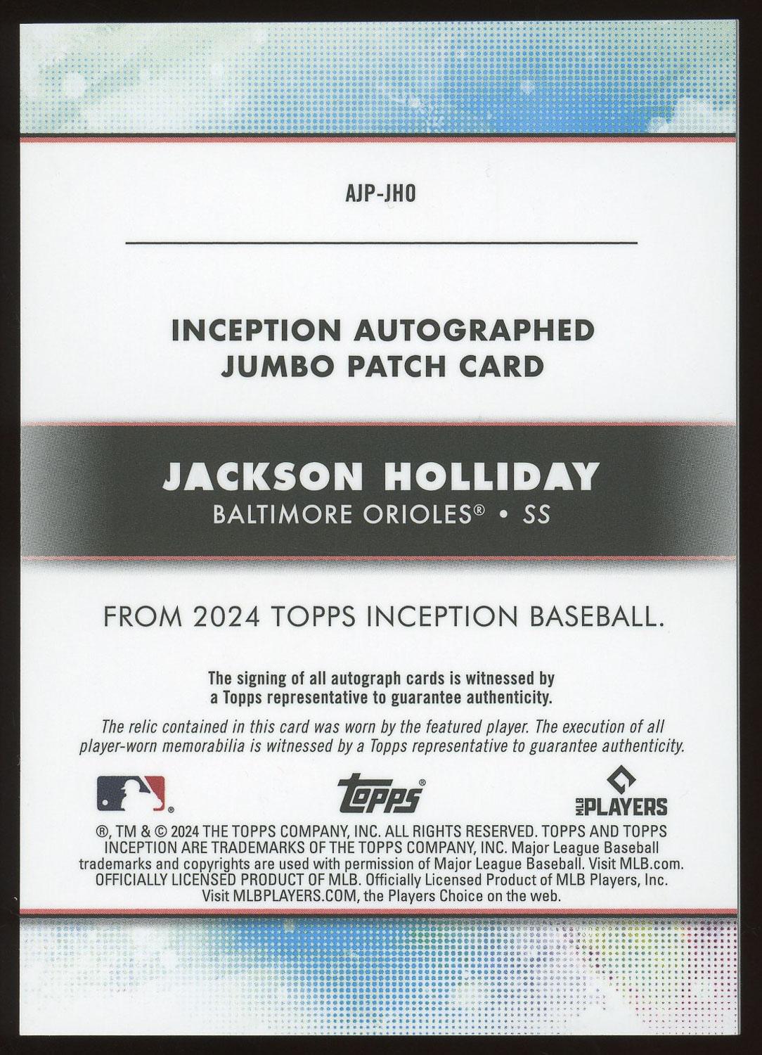 Jackson Holliday 2024 Topps Inception Jumbo Player Worn Rookie Patch Autograph Card 122/125!
