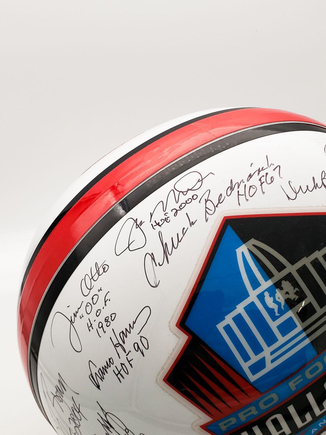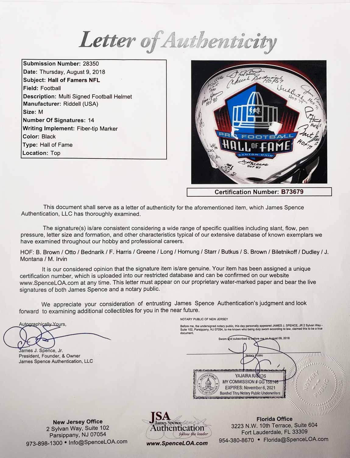 This autographed full size Riddell replica helmet has been personally hand-signed by 14 Hall of Famers including Joe Montana, Jim Brown, Franco Harris, Joe Greene, Jim Otto, Chuck Bednarik, Howie Long, Bart Starr, Paul Hornung, Dick Butkus, Michael Irvin, Bullet Bill Dudley, Fred Biletnikoff & Bob Brown. Each player added their Hall of Fame year inscription along with their signature. This autograph is certified by James Spence Authentication (JSA). It comes with the numbered hologram and matching Letter of Authenticity. Please note the typo on the JSA letter, it states "S. Brown" when it should read "J. Brown".