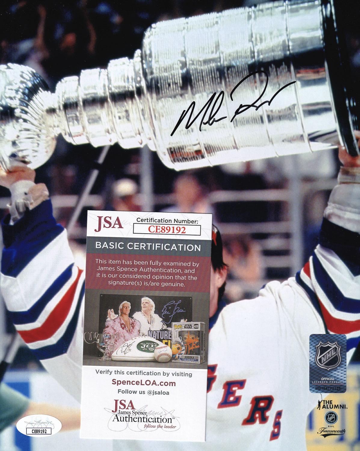 This autographed 8x10 photo has been personally hand-signed by Mike Richter of the New York Rangers. This autograph is certified by James Spence Authentication (JSA). It comes with the numbered hologram and matching Certificate of Authenticity.