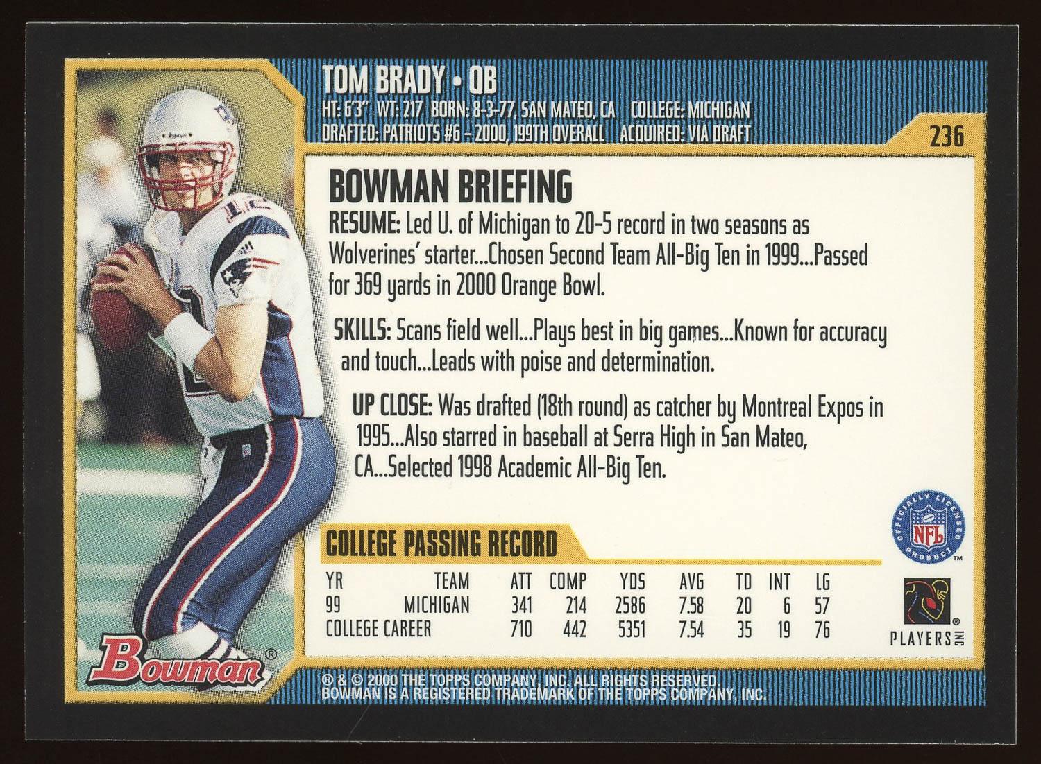 Tom Brady New England Patriots 2000 Bowman Rookie Card #236. Please see pictures for details on the condition of this card.