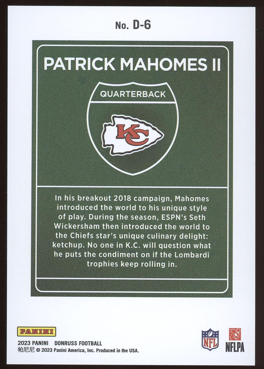 Patrick Mahomes Kansas City Chiefs 2023 Panini Donruss Downtown Card #6. Please see pictures for details on the condition of this card.