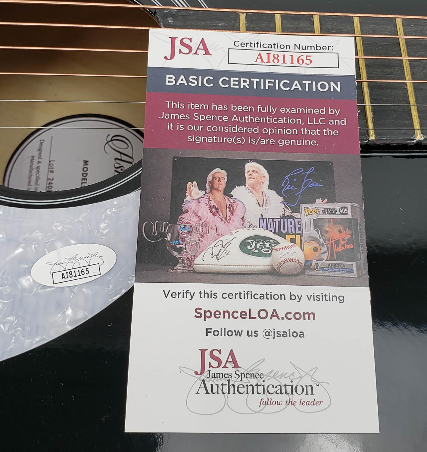 This autographed pickguard on an acoustic guitar has been personally hand-signed by Jason Aldean. This autograph is certified by James Spence Authentication (JSA). It comes with the numbered hologram and matching Certificate of Authenticity.