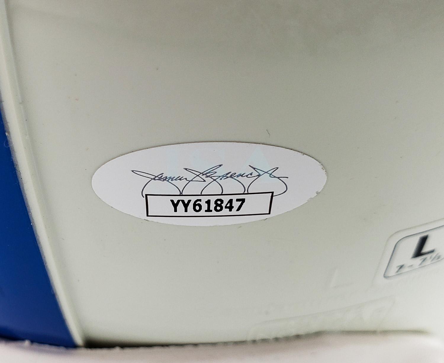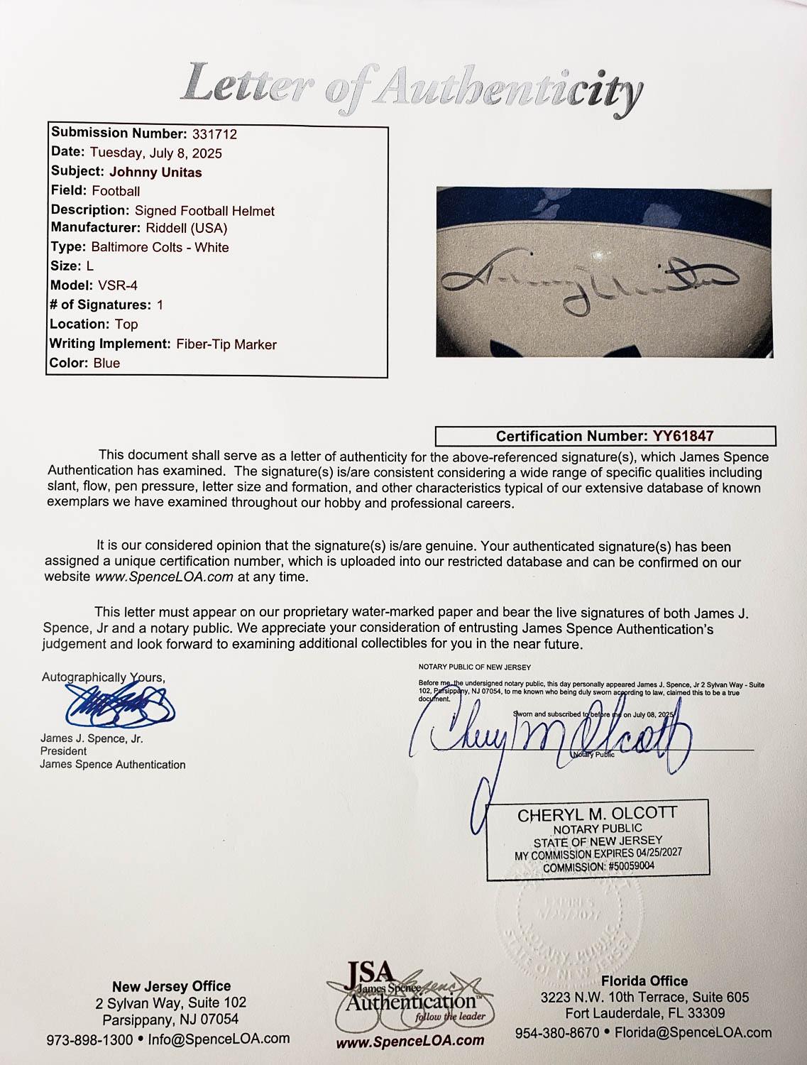 This autographed full size Riddell authentic helmet has been personally hand-signed by Johnny Unitas of the Baltimore Colts. This autograph is certified by James Spence Authentication (JSA). It comes with the numbered hologram and matching Letter of Authenticity. Please note, the signature is faded some n the middle. The "J" at the beginning and the "TAS" at the end are darker than the rest of the signature
