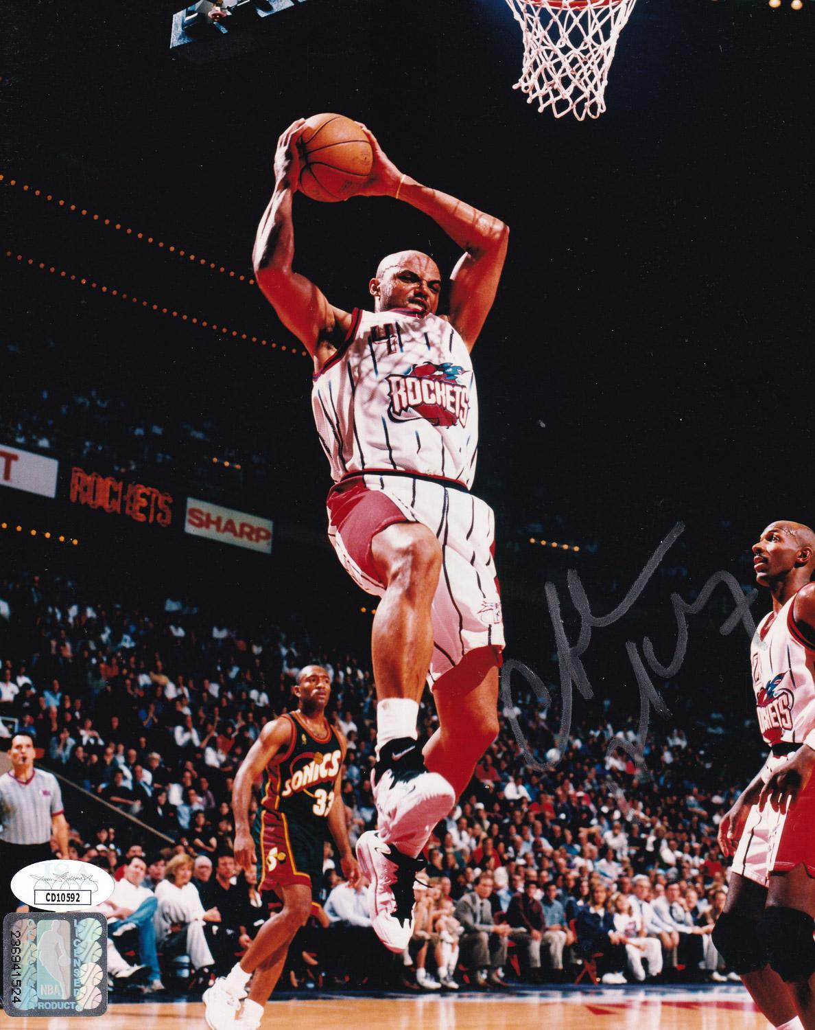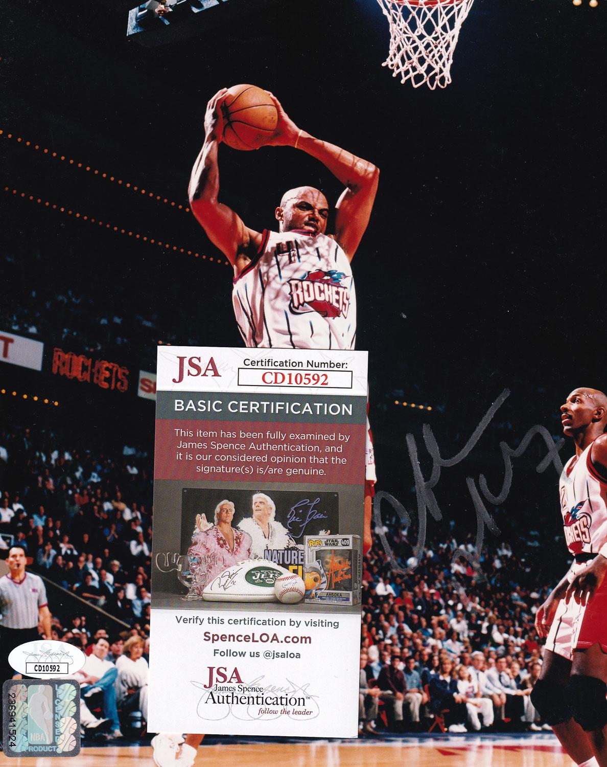 This autographed 8x10 photo has been personally hand-signed by Charles Barkley of the Houston Rockets. This autograph is certified by James Spence Authentication (JSA). It comes with the numbered hologram and matching Certificate of Authenticity.