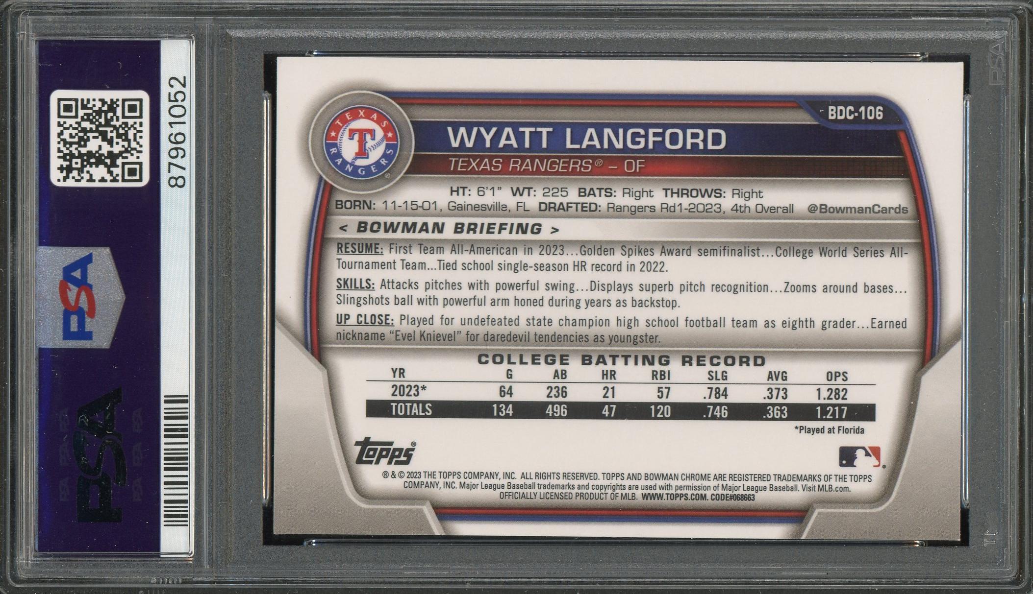 Wyatt Langford 2023 Bowman Chrome Sapphire Edition 1st Bowman Card #106 PSA Gem Mint 10!