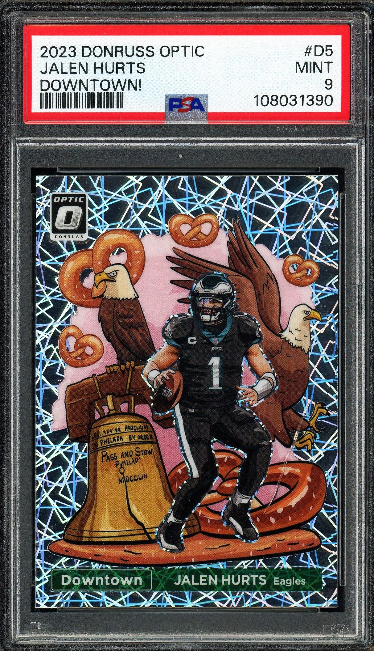 Jalen Hurts Philadelphia Eagles 2023 Donruss Optic Downtown! Card. This card has been graded Mint 9 by PSA (Professional Sports Authenticators).