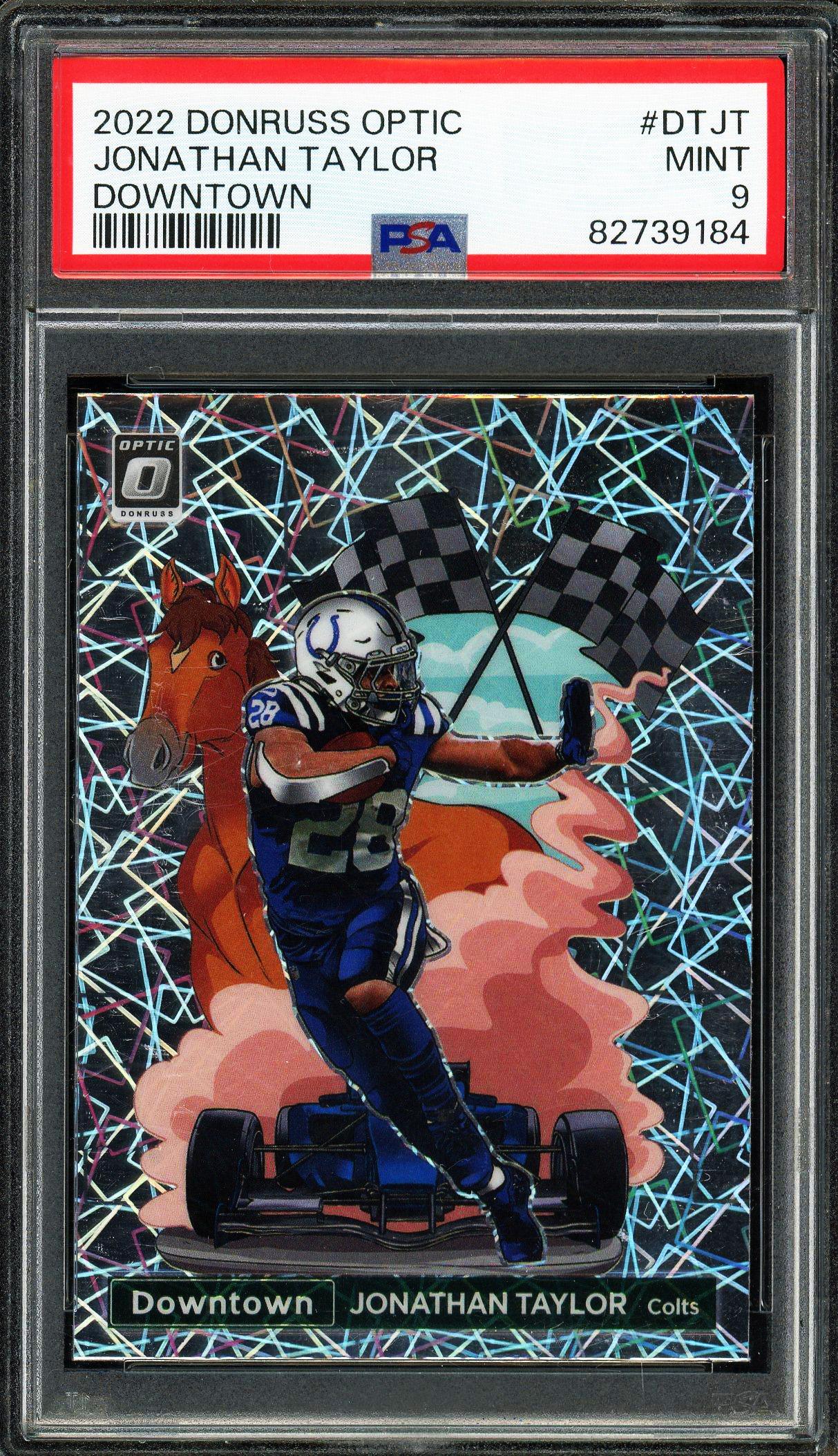 Jonathan Taylor Indianapolis Colts 2022 Donruss Optic Downtown Card. This card has been graded Mint 9 by PSA (Professional Sports Authenticators).