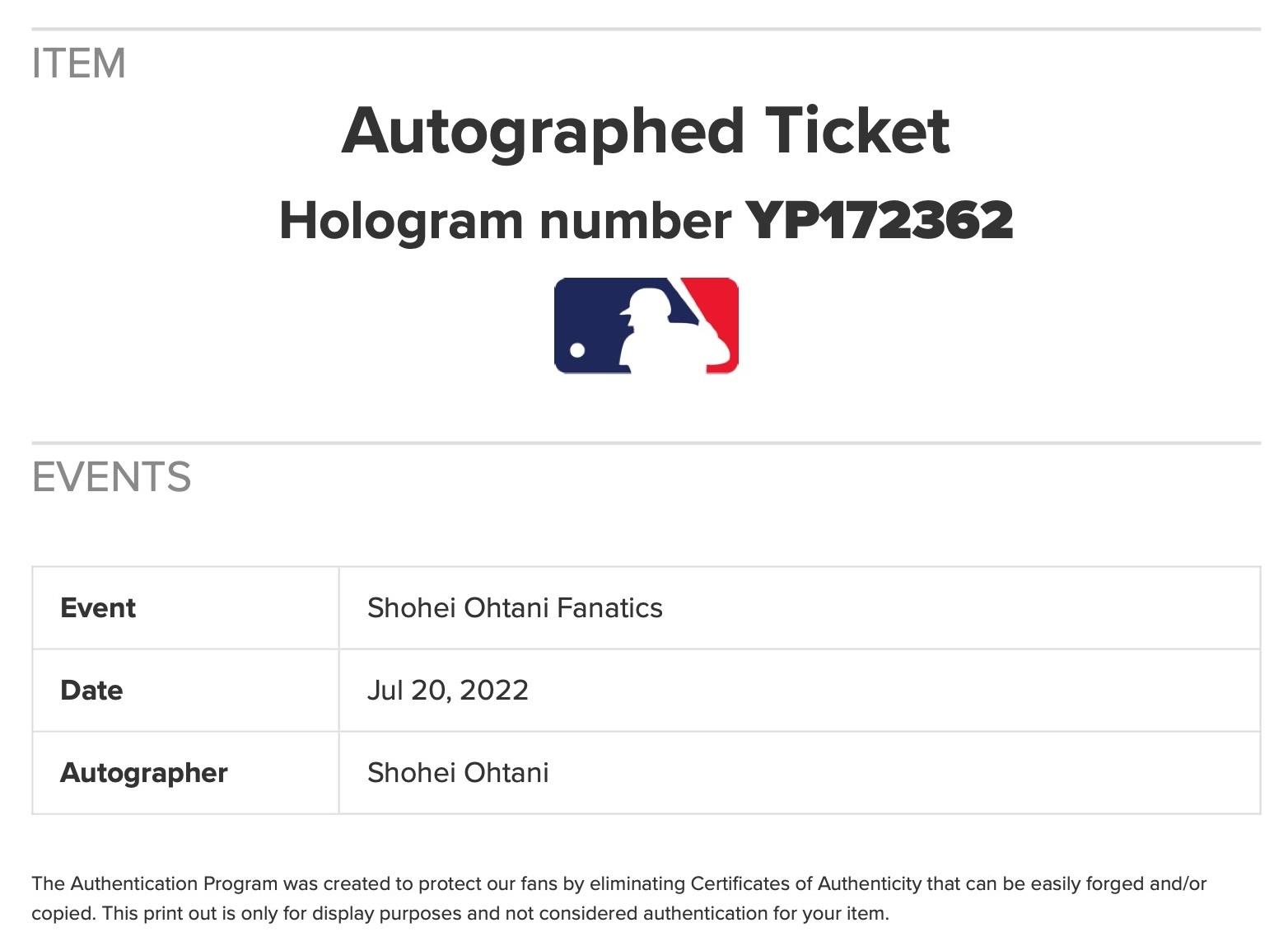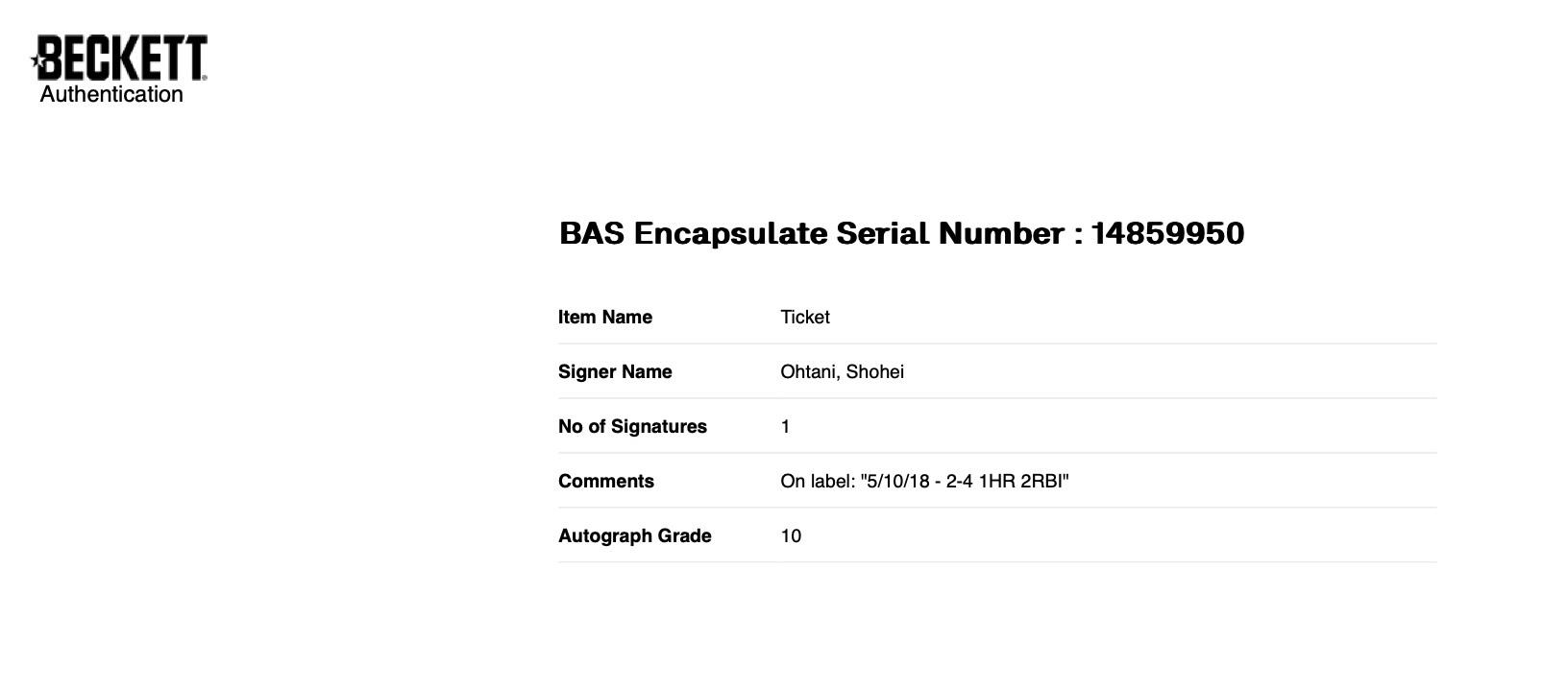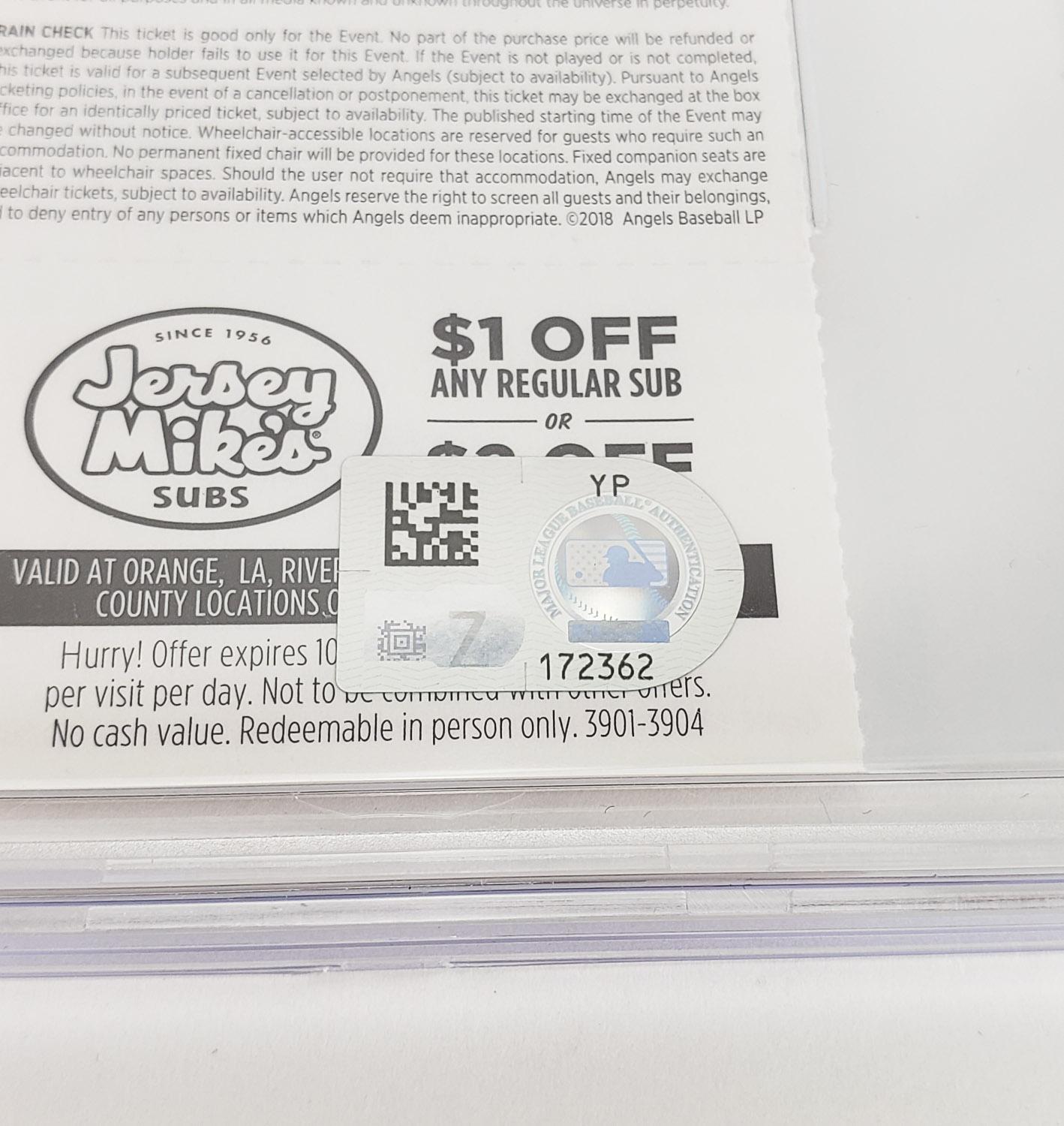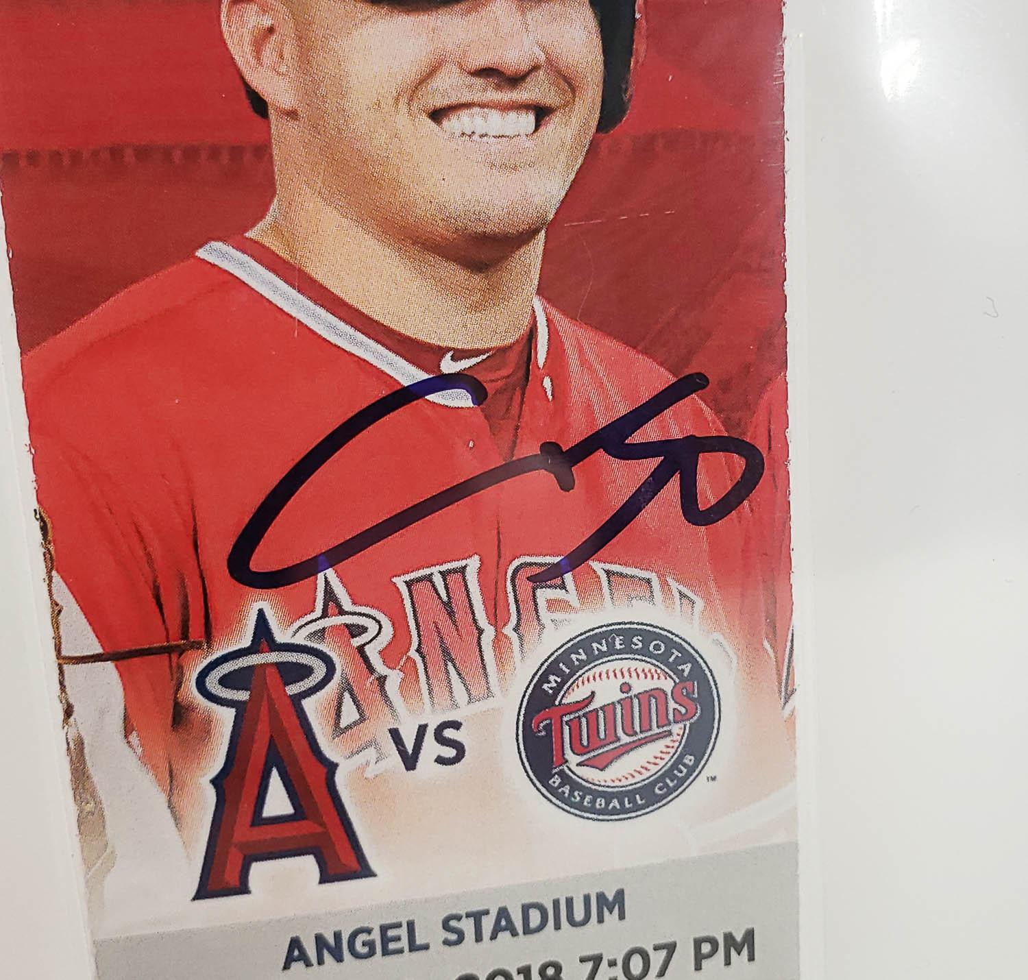 This autographed ticket has been personally hand-signed by Shohei Ohtani of the Los Angeles Angels. This ticket is from Ohtani's rookie year. Ohtani went 2 for 4 with a home run, the 5th of his career! This autograph is certified by Beckett, Fanatics and MLB. It comes encapsulated and authenticated by Beckett and Fanatics in the plastic case with an autograph grade of 10! It also comes with an authentication hologram from MLB on the back of the ticket which can be verified on MLB.com.