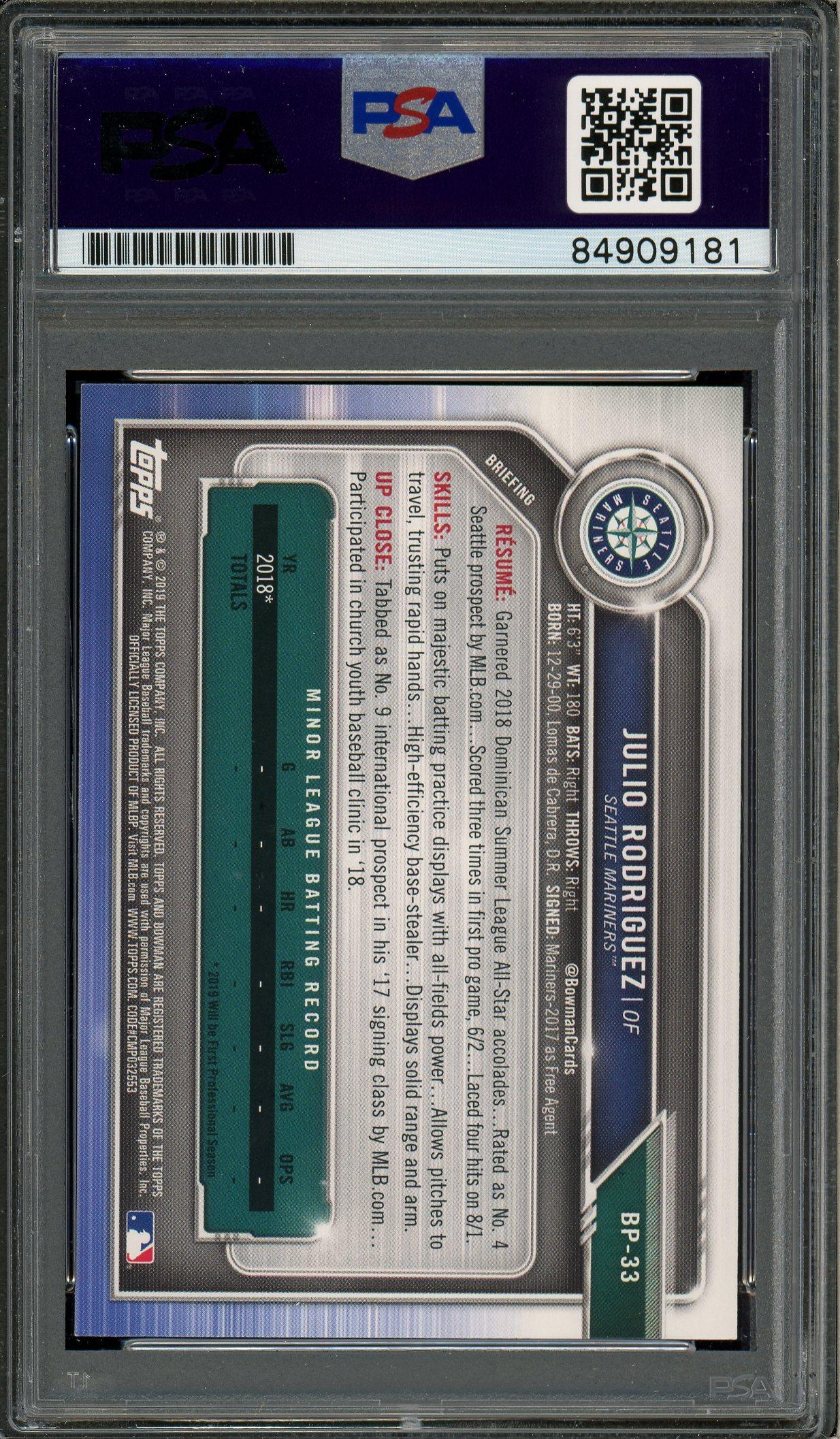 Julio Rodriguez Signed 2019 Bowman 1st Bowman Card #33 PSA w/10 Auto!
