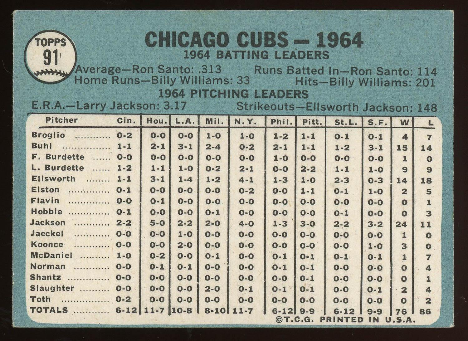 Chicago Cubs 1965 Topps Team Card #91. Please see pictures for details on the condition of this card.