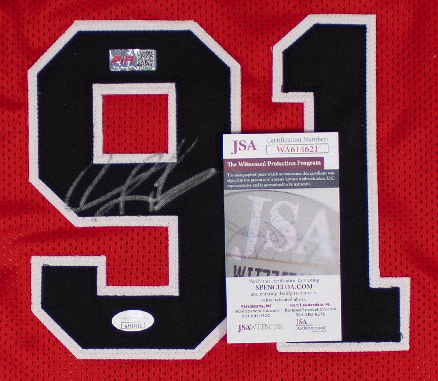 This autographed jersey has been personally hand-signed by Dennis Rodman of the Chicago Bulls. This autograph is certified by James Spence Authentications (JSA) Witnessed Protection Program. That means that a JSA representative was present when this item was signed. It comes with the numbered hologram and matching Certificate of Authenticity.