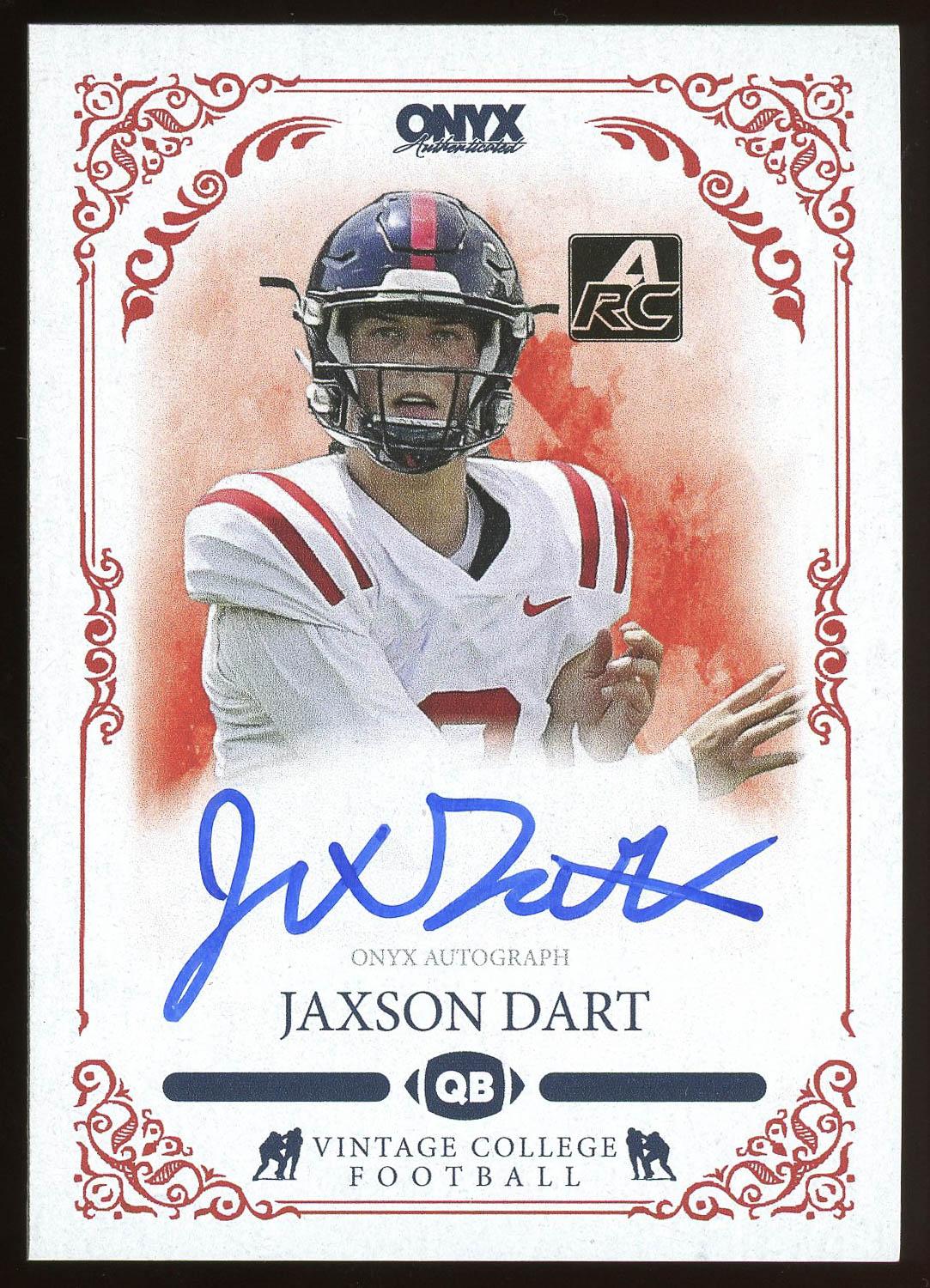 Jaxson Dart Ole Miss Rebels 2022 Onyx Authenticated Autograph Rookie Card. Please see pictures for details on the condition of this card.