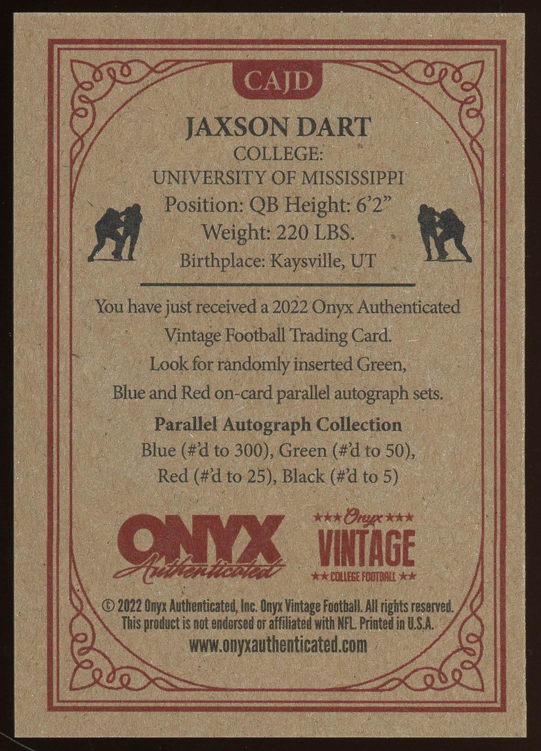 Jaxson Dart 2022 Onyx Authenticated Autograph Rookie Card