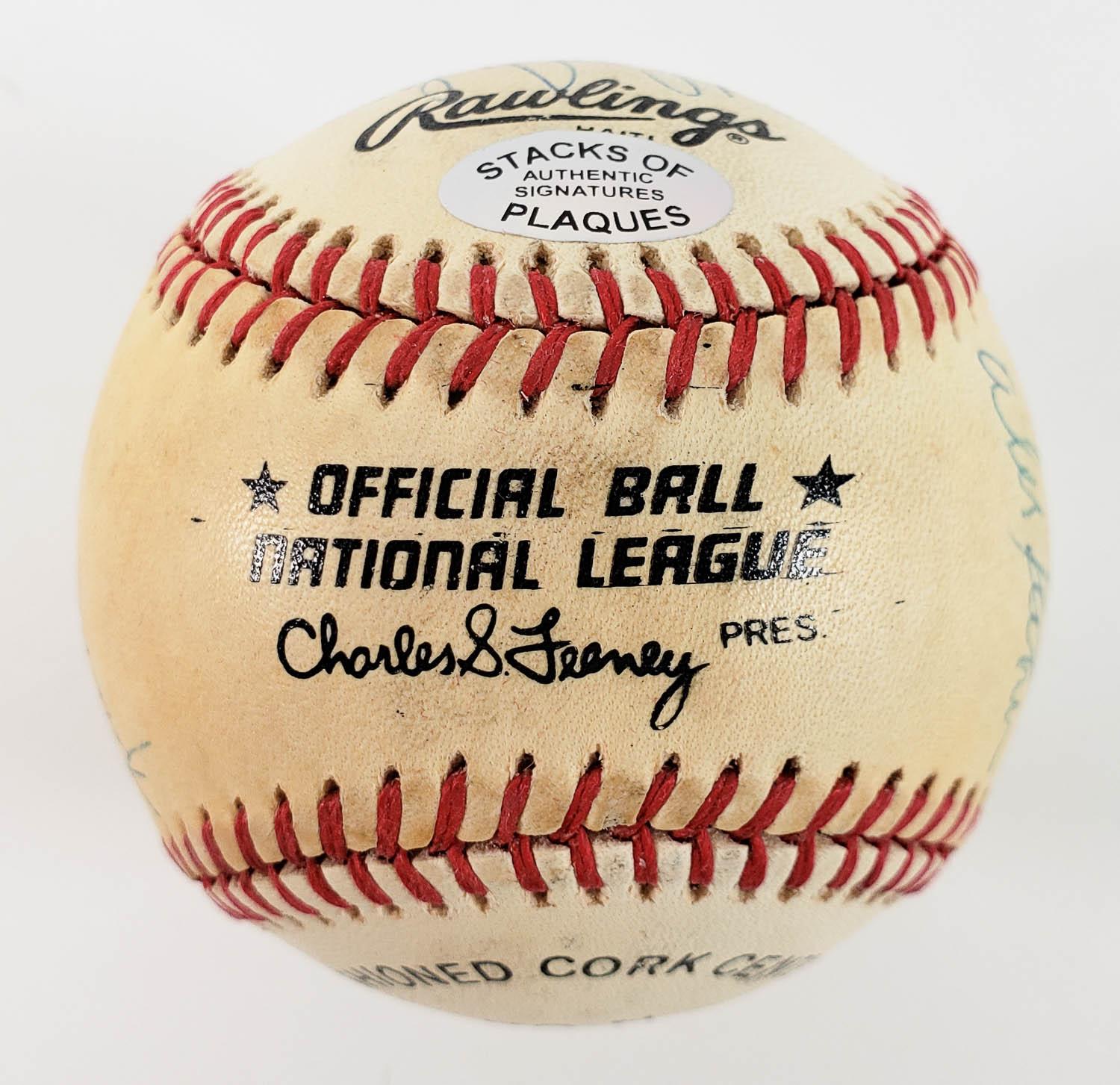 This autographed Charles Feeney ONL baseball has been personally hand-signed by 14 members of the Dodgers. ***Please note, the Campanella signature on this ball is a clubhouse version. Autographs include Duke Snider, Preacher Roe, Don Drysdale, Carl Furillo, Carl Erskine, Ralph Branca, Tommy Davis, Clem Labine, Sweet Lou Johnson, Ted Sizemore, Ron Peronoski, Wes Parker & Ken McMullin. This autograph is certified by Stacks of Plaques (SOP). It comes with the Stacks of Plaques authentication hologram.