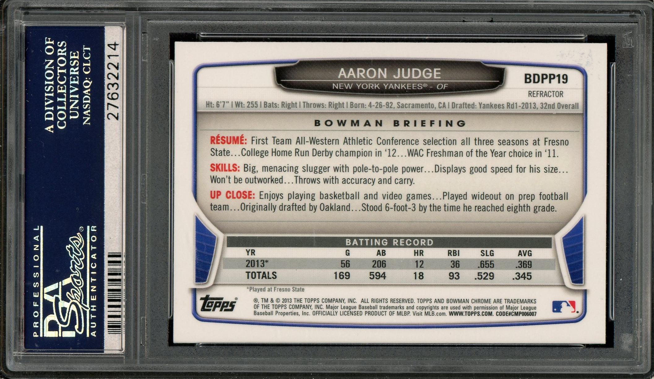 Aaron Judge 2013 Bowman Chrome Draft Picks & Prospects Refractor Card PSA Gem Mint 10!