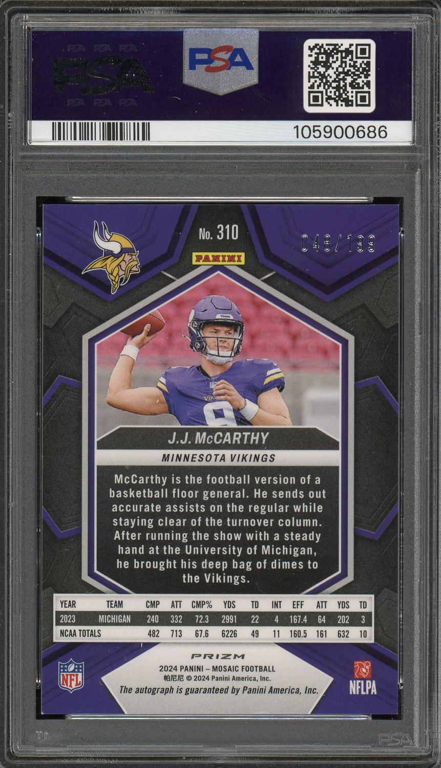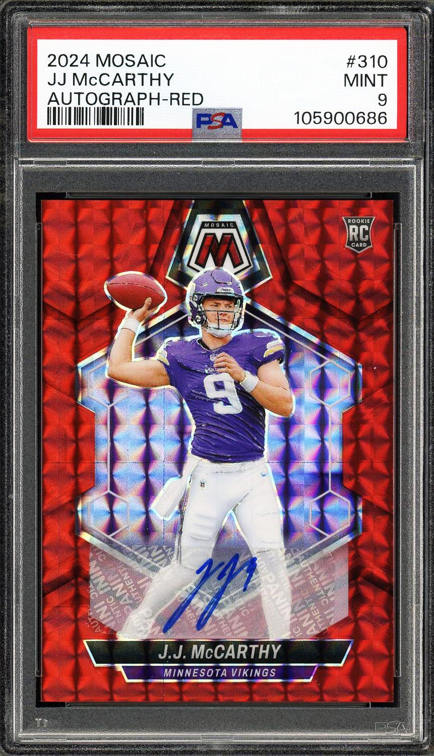 J.J. McCarthy 2024 Panini Mosaic Red Mosaic Autograph Rookie Card 48/199! PSA 9