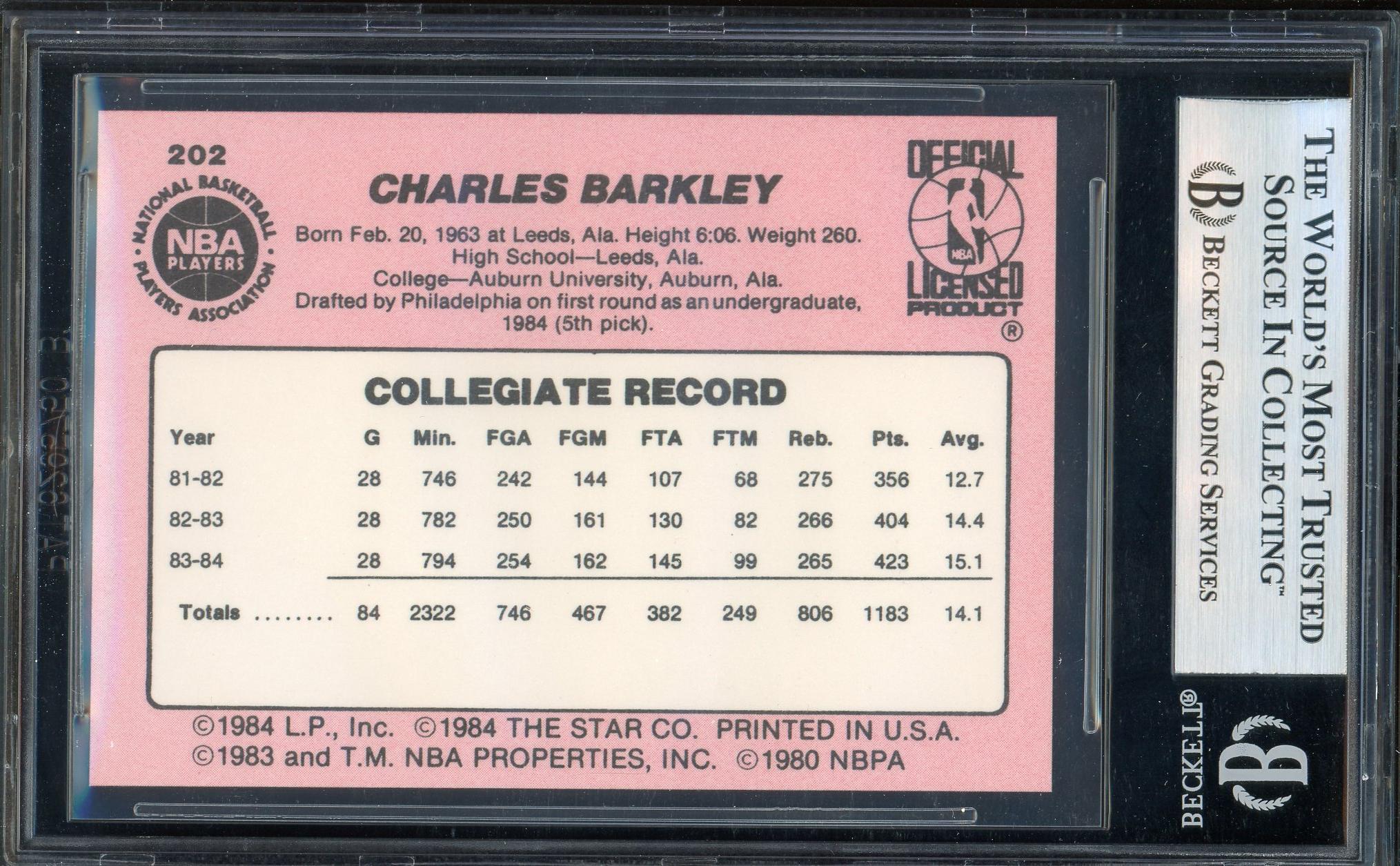 Charles Barkley Philadelphia Sixers 1984 Star Rookie Card #202. This card has been graded Mint 9 by BGS (Beckett Grading Services).