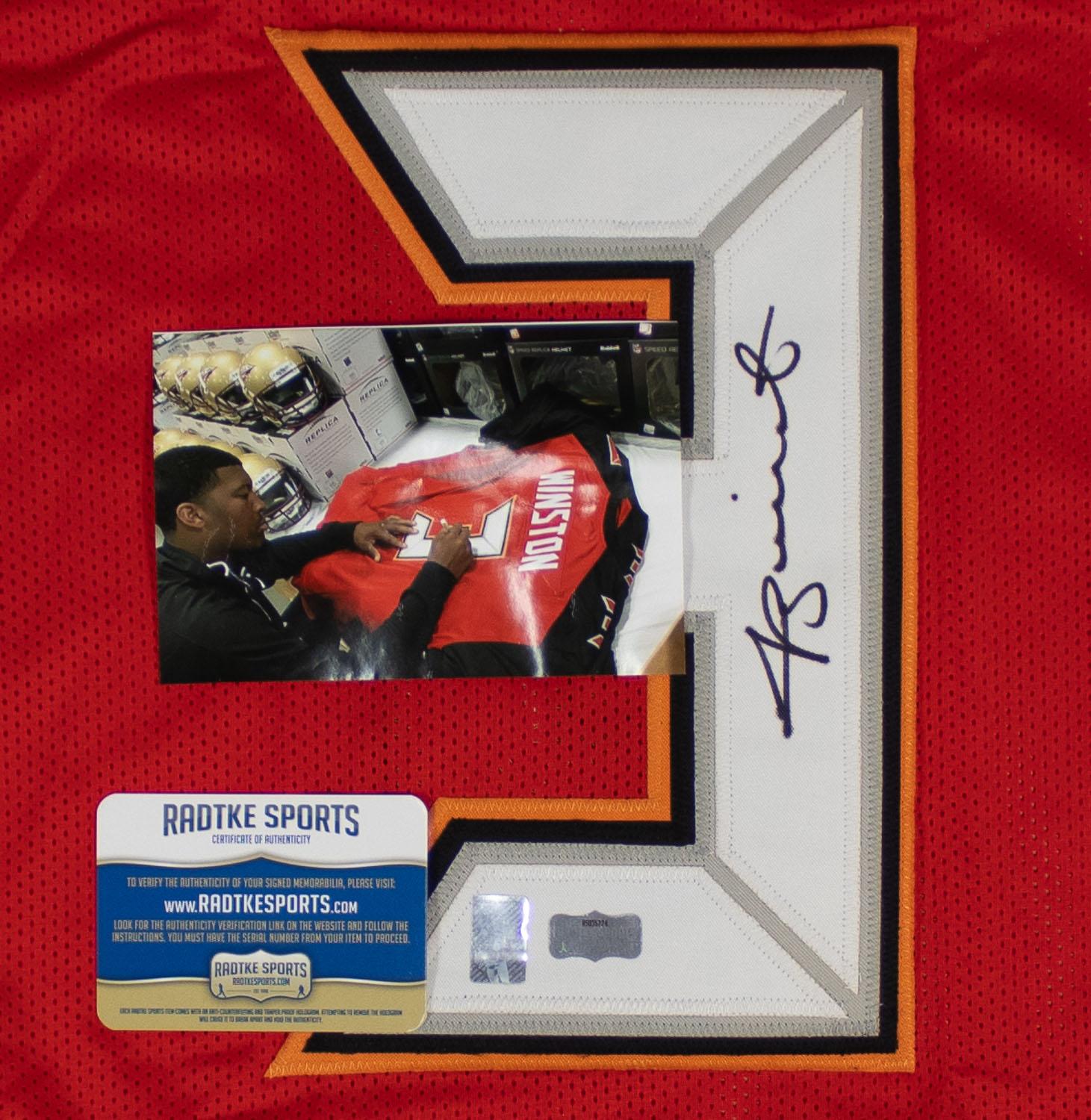 This autographed jersey has been personally hand-signed by Jameis Winston of the Tampa Bay Bucanneers. This autograph is certified by Radtke Sports. It comes with the Certificate of Authenticity and matching numbered hologram, which can be verified on their website, Radtkesports.com.