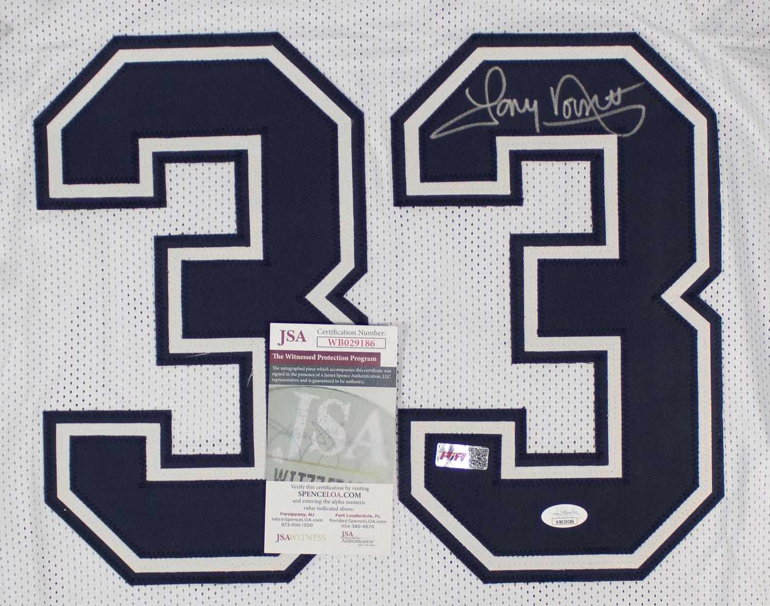 This autographed jersey has been personally hand-signed by Tony Dorsett of the Dallas Cowboys. This autograph is certified by James Spence Authentication's (JSA) Witnessed Protection Program. That means that a JSA representative was present when this item was signed. It comes with the numbered hologram and matching Certificate of Authenticity.
