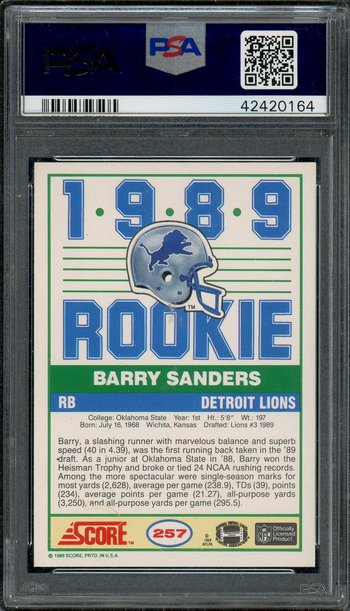 Barry Sanders Detroit Lions 1989 Score Rookie Card #257. This card has been graded NM MT 8 by PSA (Professional Sports Authenticators).