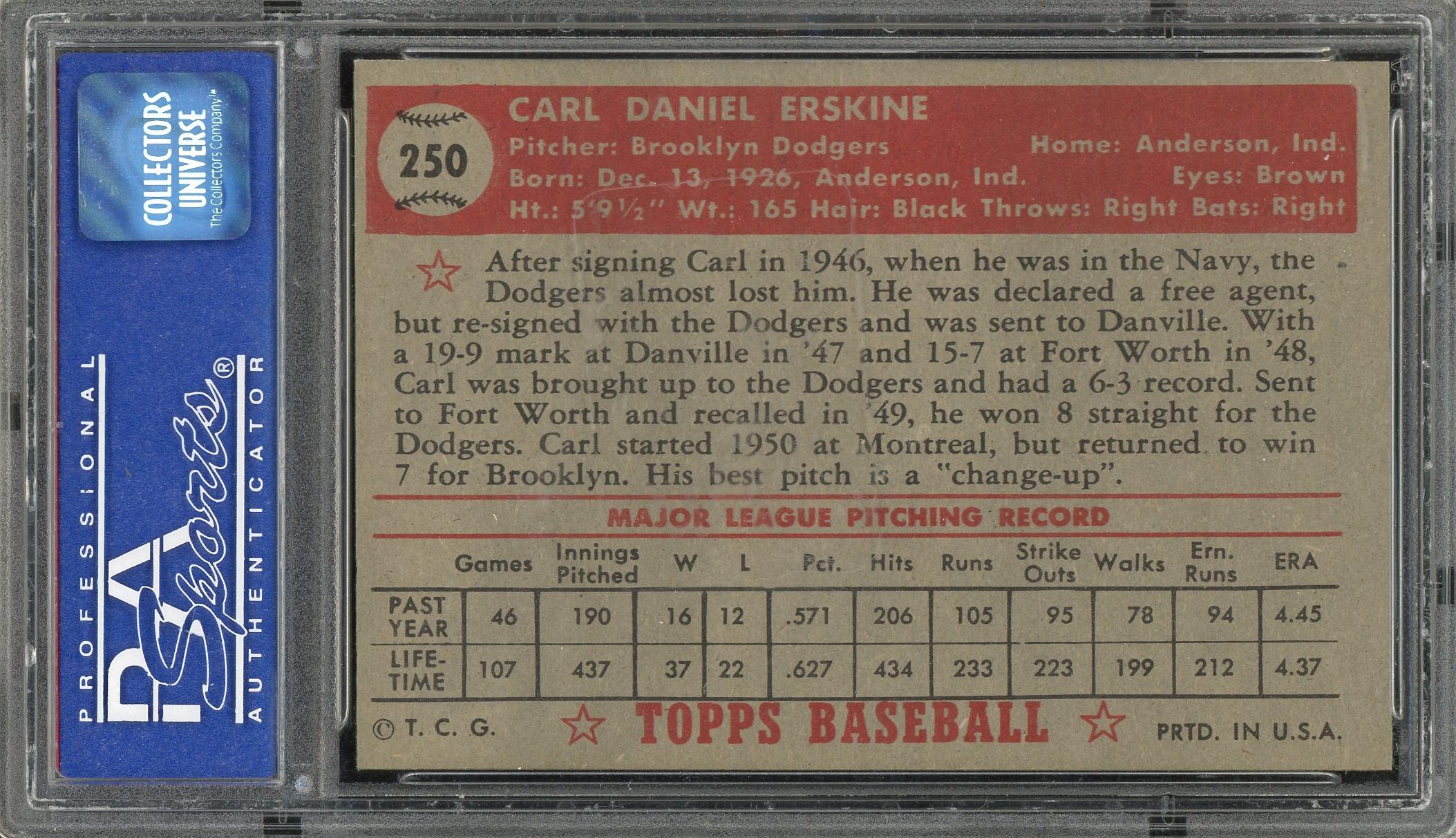 Carl Erskine Brooklyn Dodgers 1952 Topps Card #250. This card has been graded NM MT 8 by PSA (Professional Sports Authenticators).